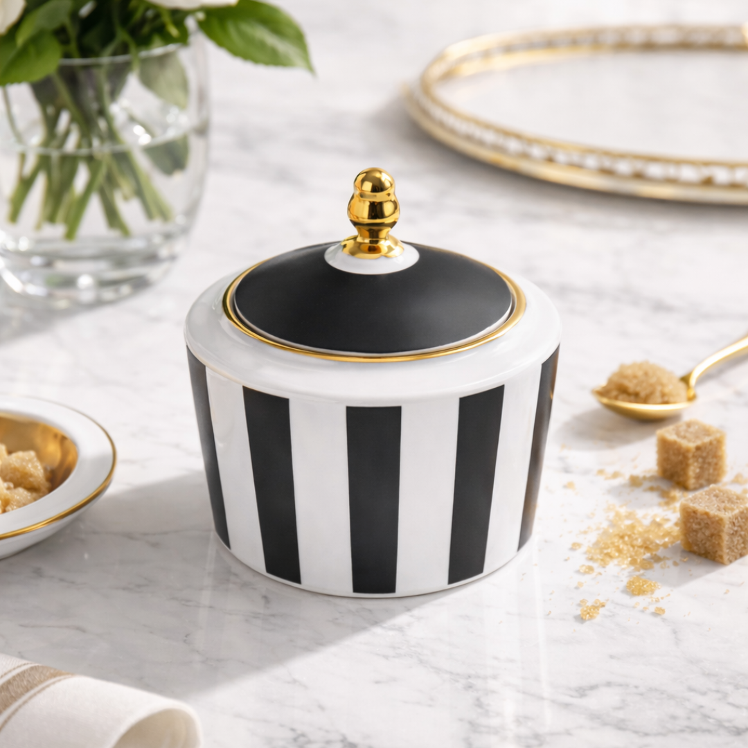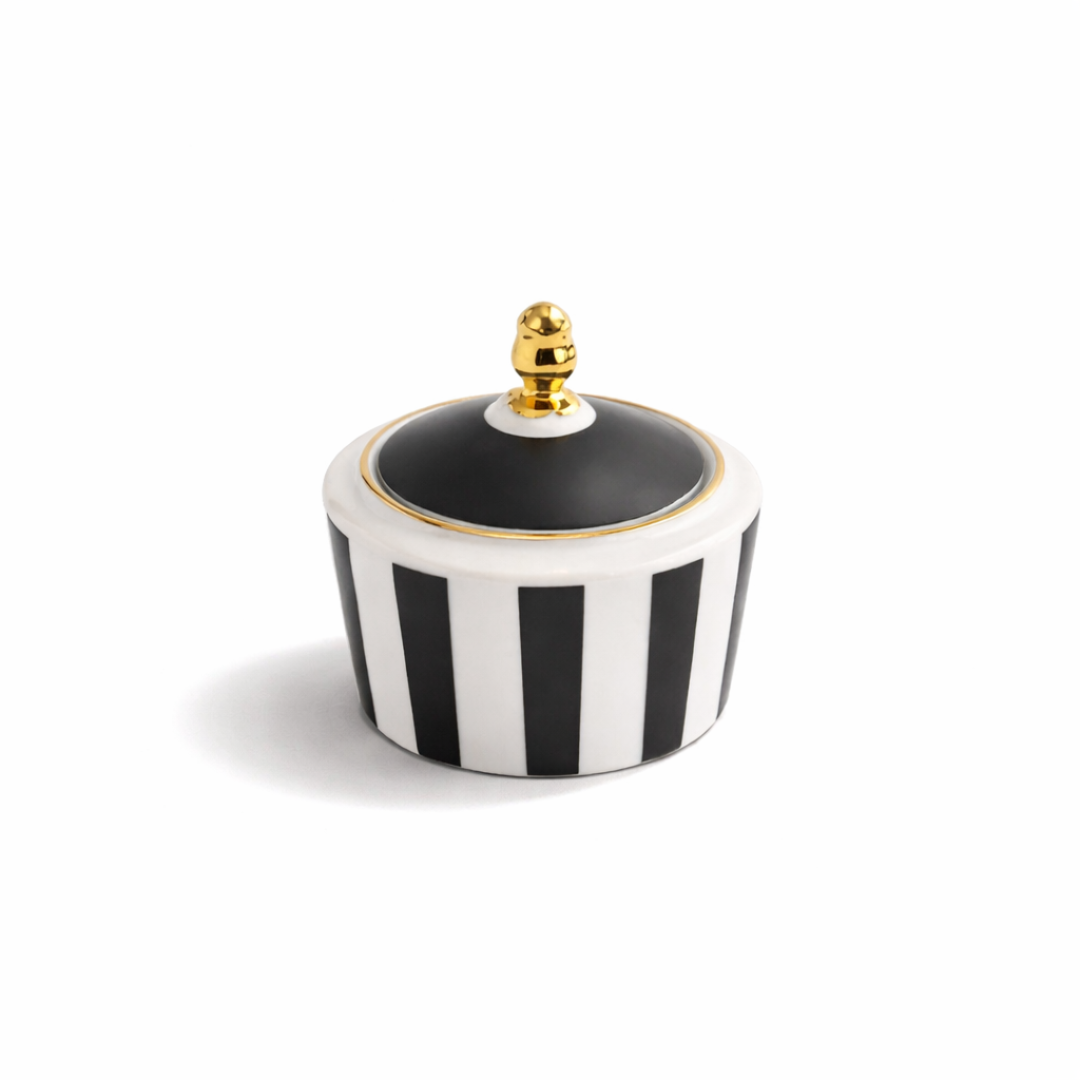 Porcelanowa cukiernica Stripes to esencja wyrafinowanego designu, w którym klasyka spotyka się z odważną, graficzną formą. Charakterystyczne szerokie, czarno-białe pasy nadają jej mocny, rozpoznawalny rytm, a ręcznie malowany, złoty detal na zwieńczeniu pokrywki subtelnie podkreśla jej biżuteryjny charakter.