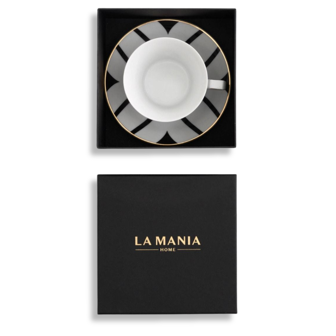 Projekt powstał w pracowni designerów La Mania, gdzie forma spotyka się z dyscypliną i harmonią proporcji. Każdy element został wykonany z wysokogatunkowej białej porcelany, a następnie ręcznie wykończony złotem przez doświadczonych, polskich rzemieślników. Perfekcyjnie dopracowane krawędzie, idealna symetria i szlachetne wykończenie podkreślają luksusowy charakter kolekcji.