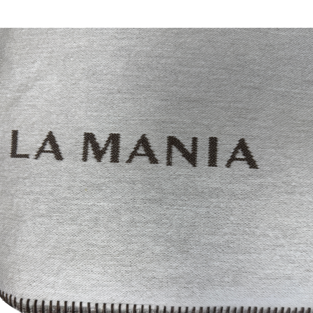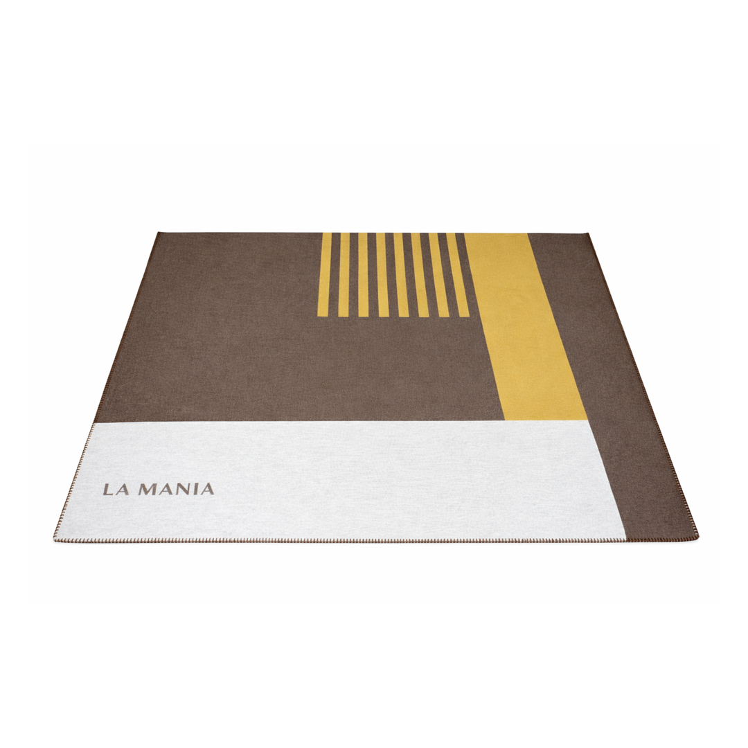 Projekt koca opiera się na prostych, eleganckich formach. Złoty pionowy pas oraz subtelny układ linii w górnej części nadają całości designerskiego i nowoczesnego stylu. Całość uzupełnia delikatne logo LA MANIA, które podkreśla ekskluzywny charakter produktu oraz jego modowe pochodzenie.