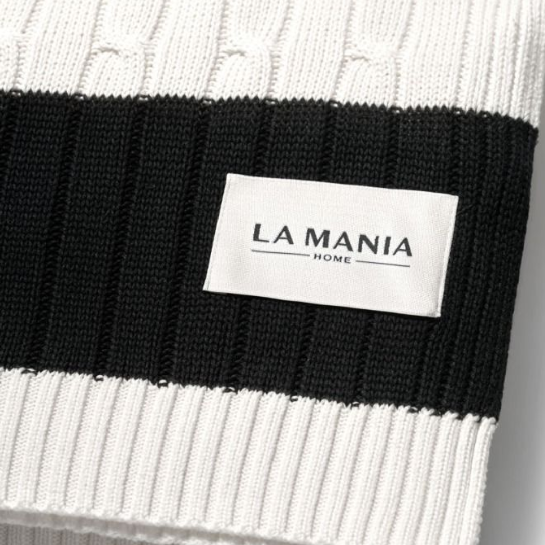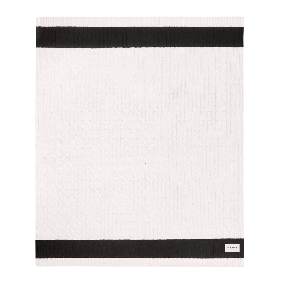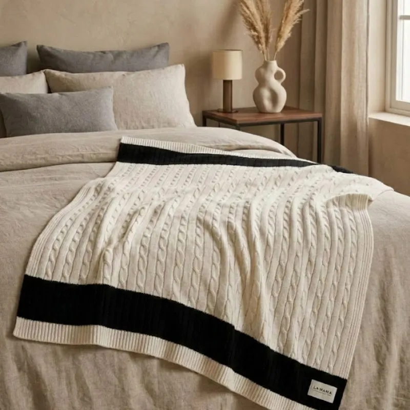 Charakterystyczna struktura splotu inspirowana klasycznymi tekstyliami nadaje kocowi szlachetny wygląd i dekoracyjną głębię. Całość została wykończona ściągaczem oraz kontrastowym czarnym pasem, który podkreśla nowoczesny charakter projektu i nadaje mu wyrazisty akcent.