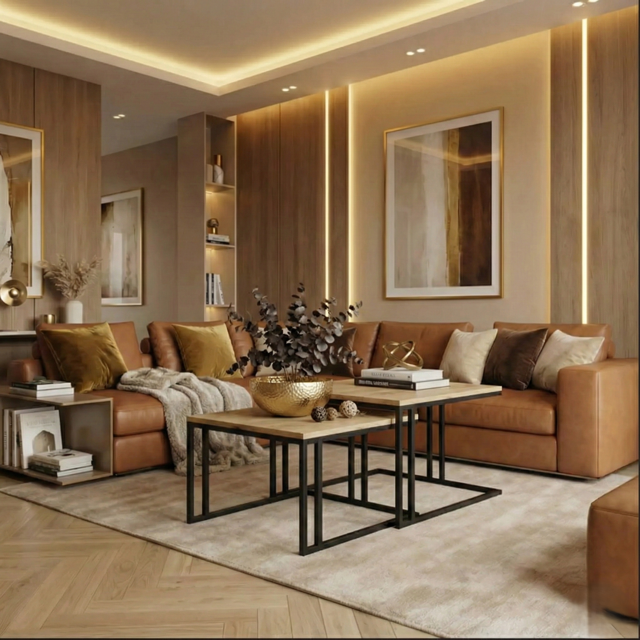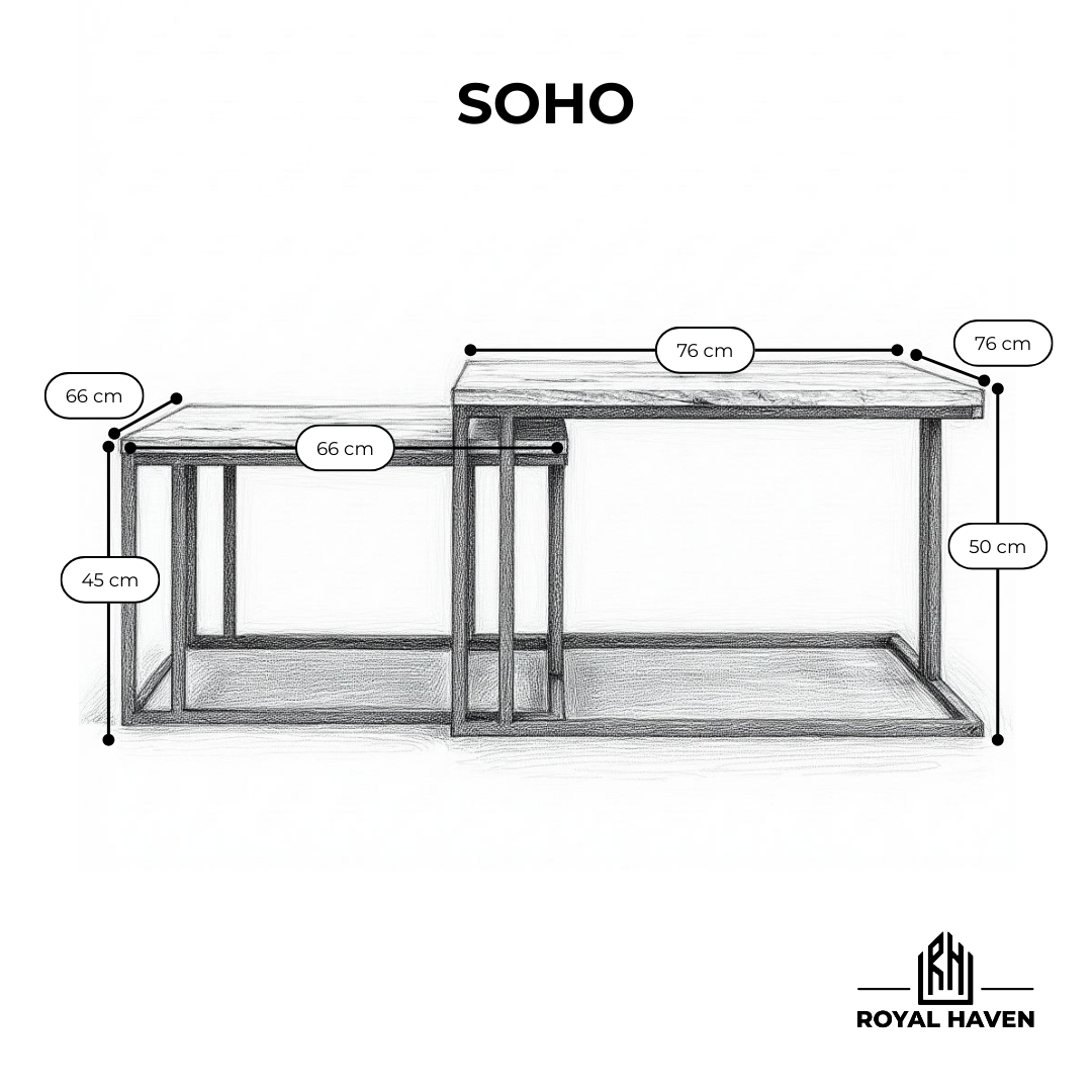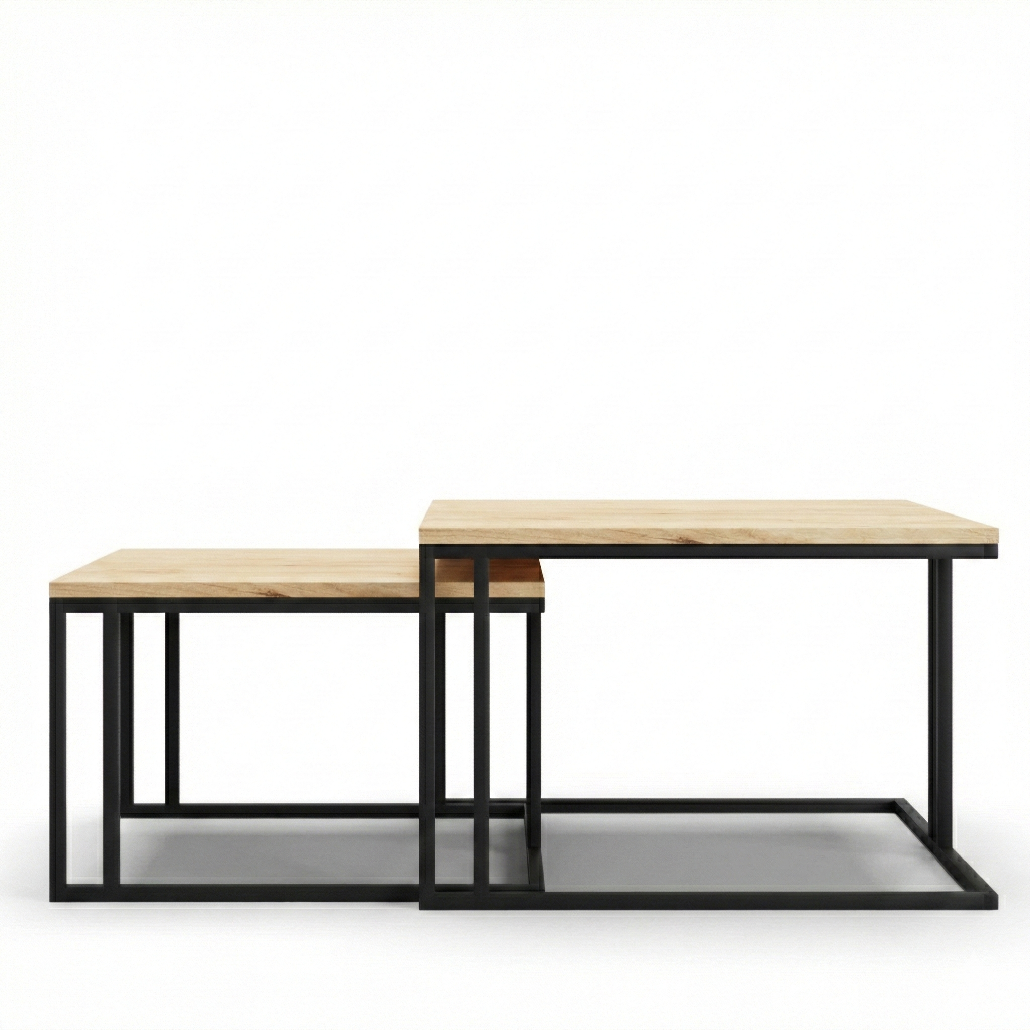 Stoliki SOHO to zestaw, który łączy prostą, nowoczesną formę z wyraźnym, loftowym charakterem. Kontrast czarnej, metalowej podstawy z ciepłym dekorem złotego dębu tworzy kompozycję, która dobrze odnajduje się zarówno w industrialnych wnętrzach, jak i w bardziej eleganckich, stonowanych aranżacjach.