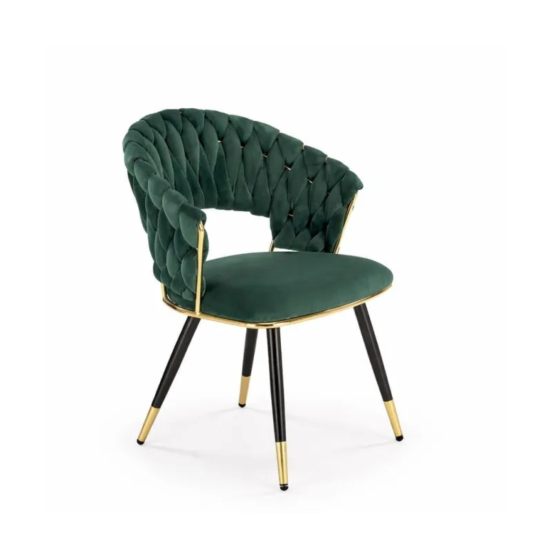 Krzesło NUVE to stylowy i praktyczny mebel, który łączy nowoczesny wygląd z wygodą codziennego użytkowania. Charakterystycznym elementem modelu jest półokrągłe, otwarte oparcie z dekoracyjną plecioną strukturą tkaniny, która nadaje całości elegancki i oryginalny wygląd. Miękkie, tapicerowane siedzisko w połączeniu z profilowanym oparciem zapewnia komfort podczas siedzenia. Krzesło dostępne jest w dwóch kolorach: butelkowej zieleni oraz szarości, dzięki czemu łatwo dopasować je do różnych aranżacji wnętrz.