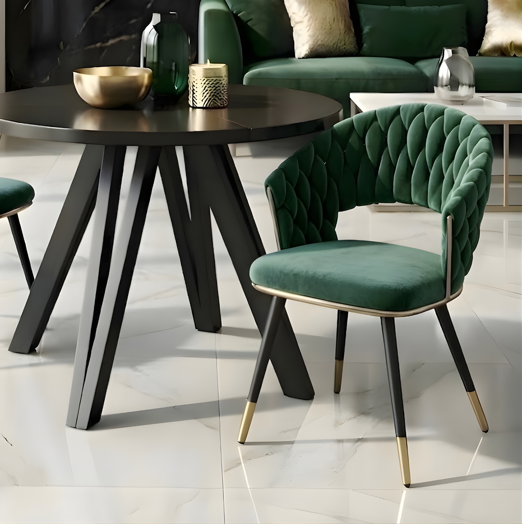 Połączenie dekoracyjnej plecionki, eleganckiej kolorystyki i złotych detali sprawia, że krzesło NUVE będzie efektownym uzupełnieniem zarówno nowoczesnych, jak i bardziej klasycznych wnętrz.