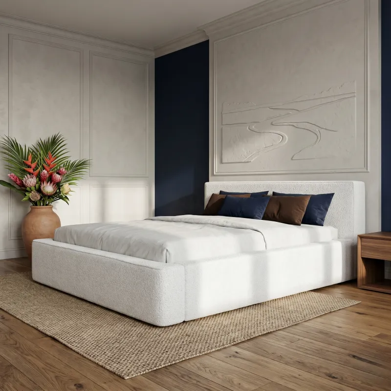 Bryła łóżka opiera się na prostych, zaokrąglonych krawędziach i miękkim tapicerowaniu, które nadaje całości lekkości i przytulności. Niski, szeroki zagłówek tworzy spokojne tło i zapewnia wygodne oparcie, bez wizualnego przeciążenia przestrzeni.To łóżko, które dobrze wygląda, ale przede wszystkim dobrze się sprawdza na co dzień.
