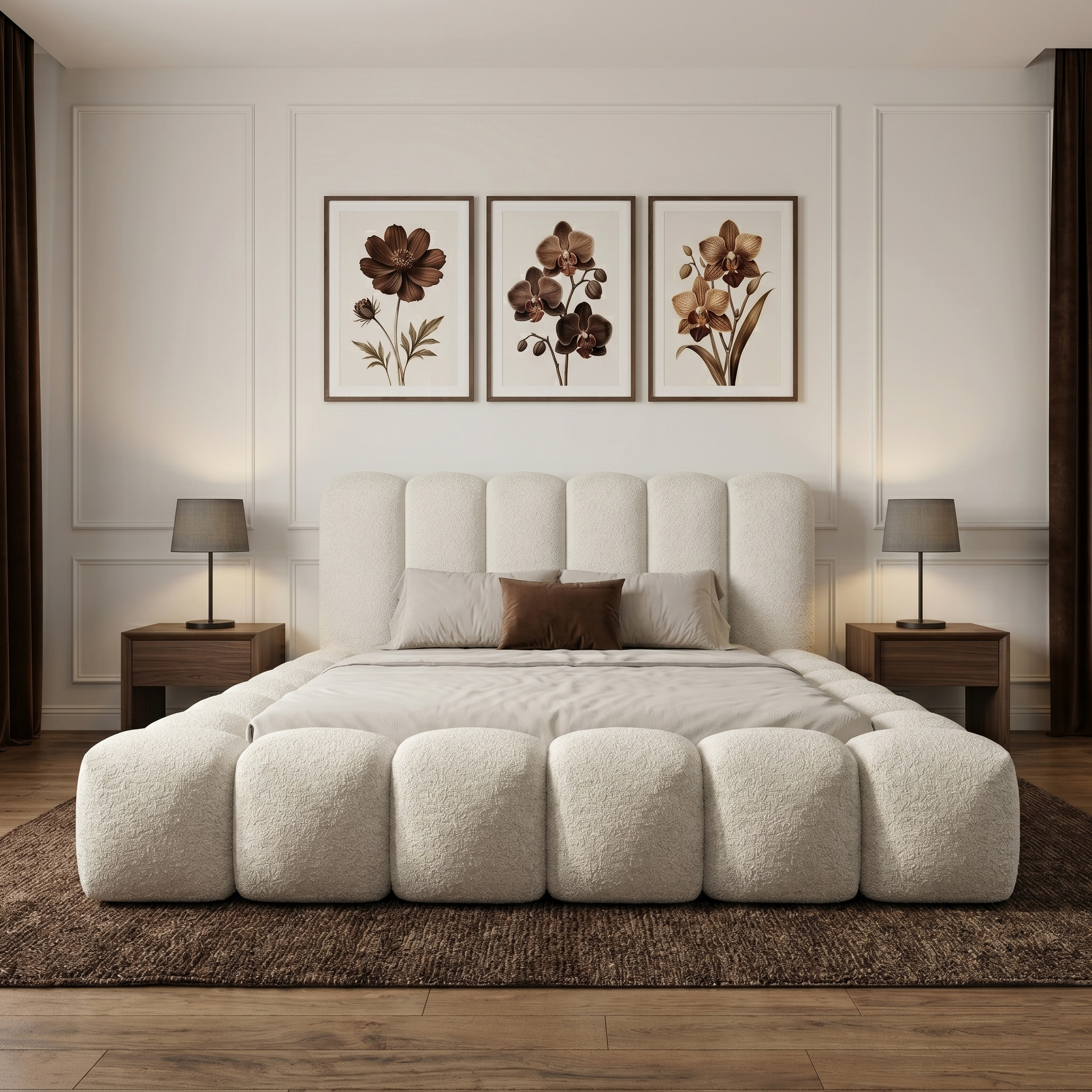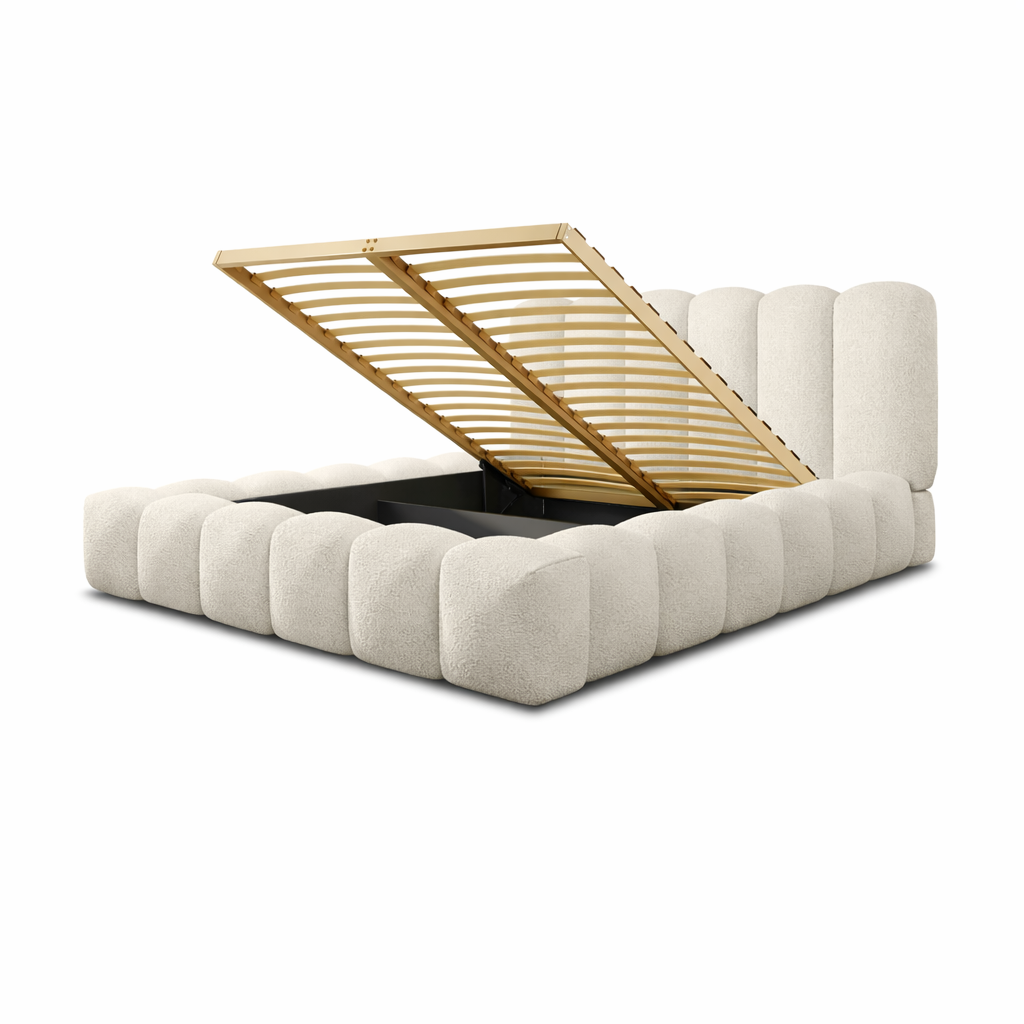 Na zdjęciu łóżko zaprezentowane jest w tkaninie boucle Quelle 03, w jasnym beżowym odcieniu.
