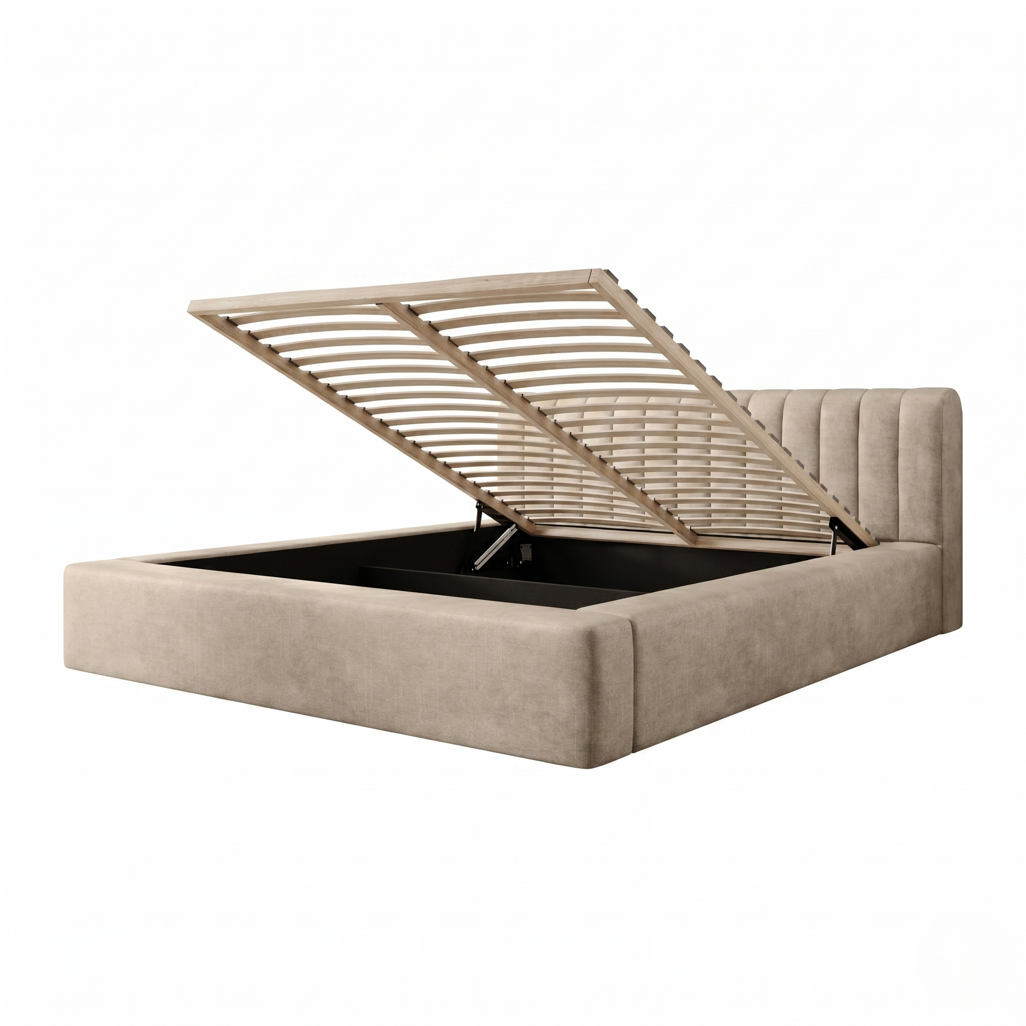 Łóżko tapicerowane 140x200 AMIRA beżowe - ze stelażem i pojemnikiem na pościel, personalizacja koloru oraz rodzaju tkaniny