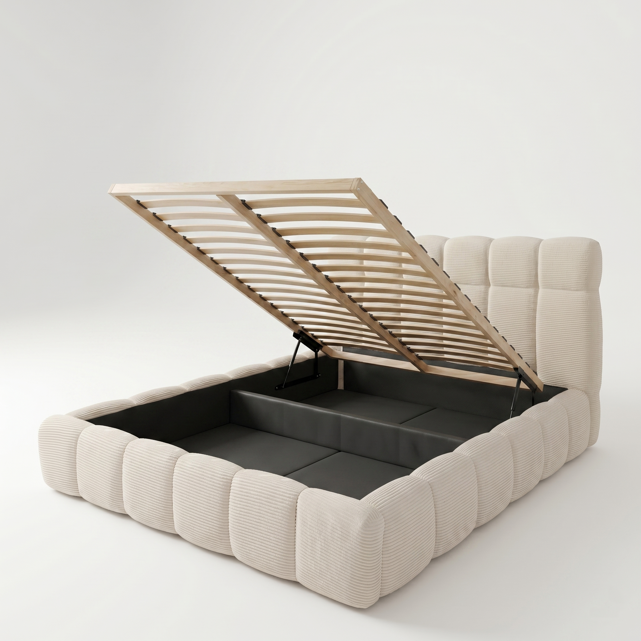 - Stelaż do wyboru - drewniany (w cenie), zapewniający stabilne podparcie materaca i odpowiednią cyrkulację powietrza, lub metalowy z podnośnikami gazowymi (za dopłatą), który ułatwia otwieranie pojemnika na pościel