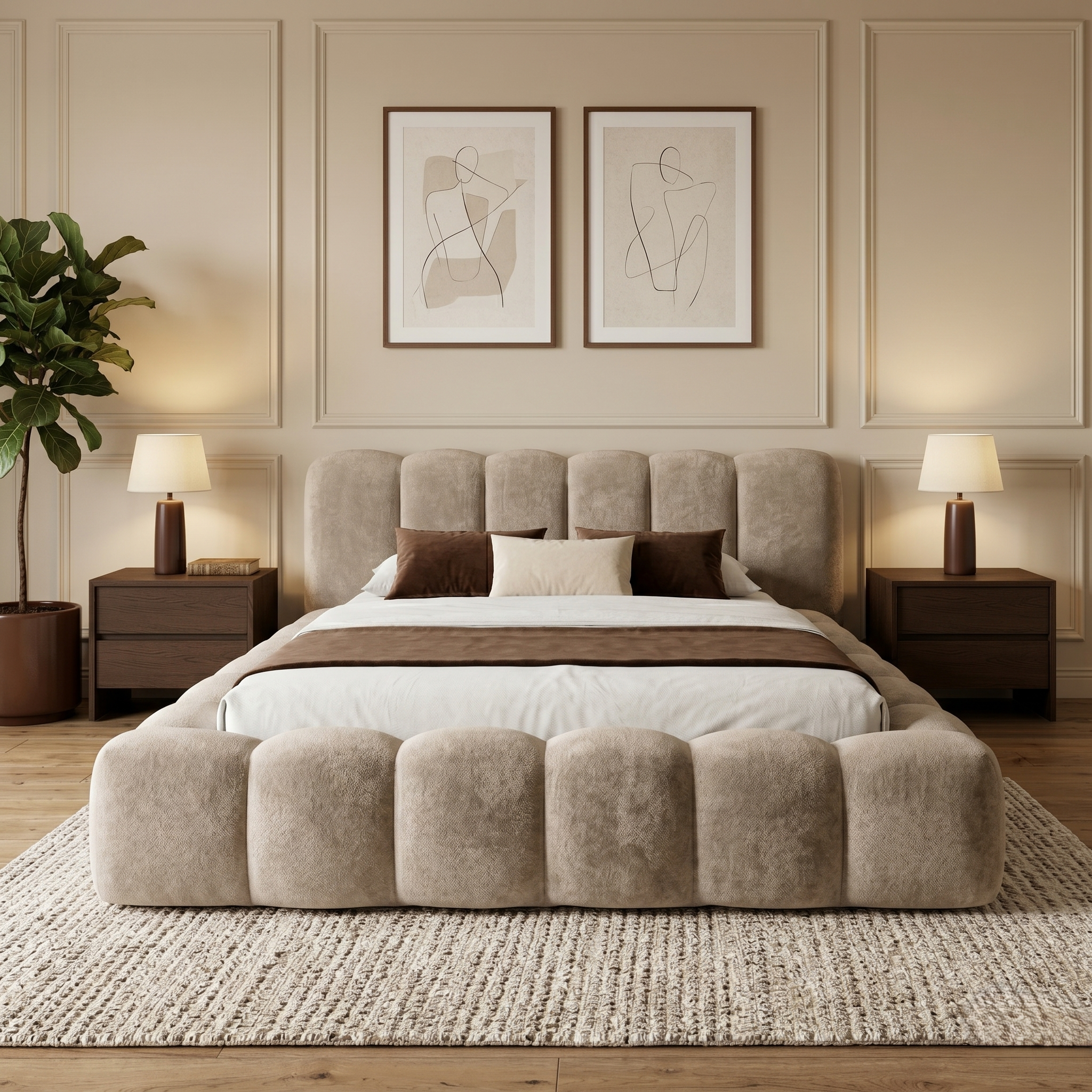 Na przedstawionej wizualizacji łóżko Dallas wykonano w tkaninie szenilowej Aphrodite 03, w klasycznym beżowym odcieniu.