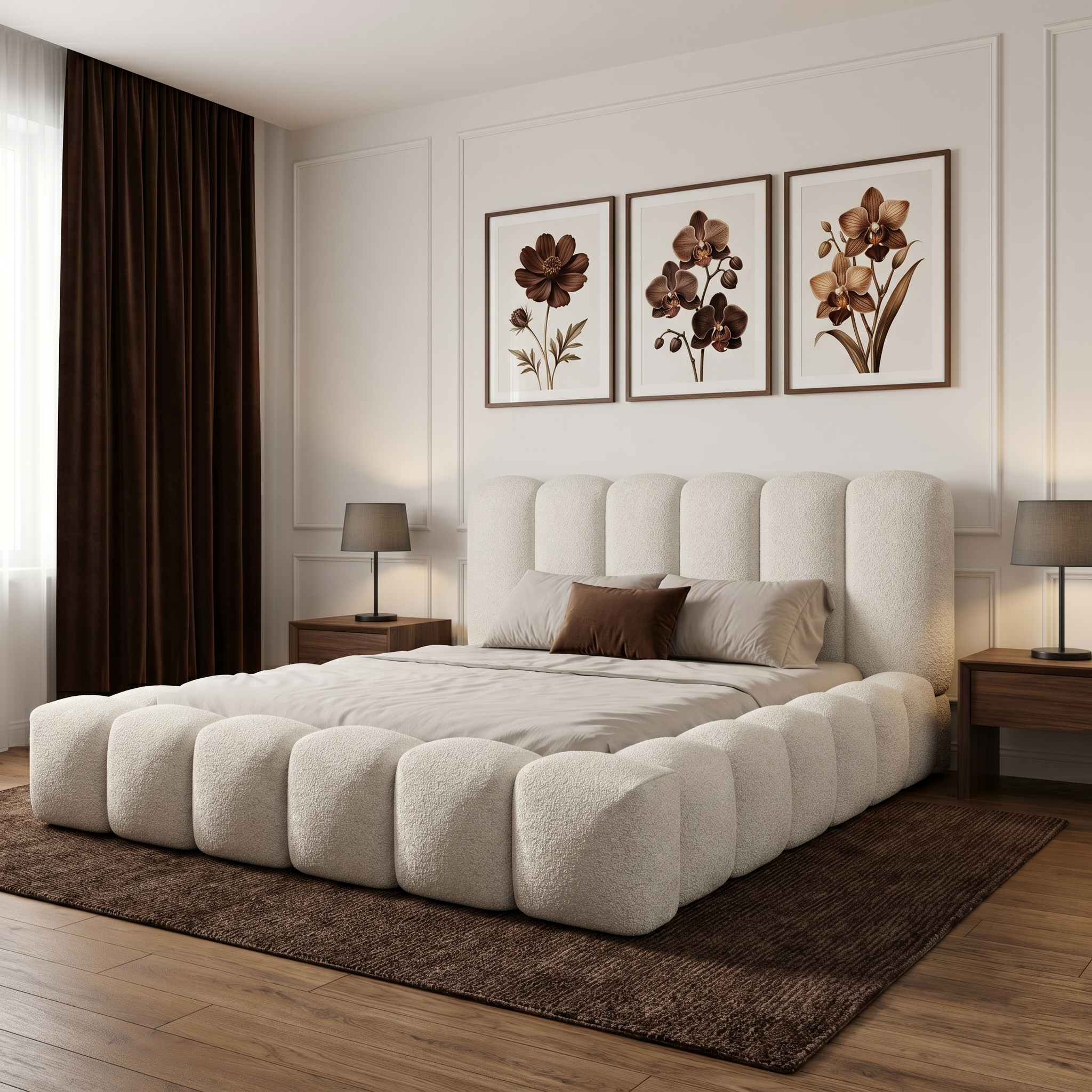 Na zdjęciu łóżko zaprezentowane jest w tkaninie boucle Quelle 03, w jasnym beżowym odcieniu.
