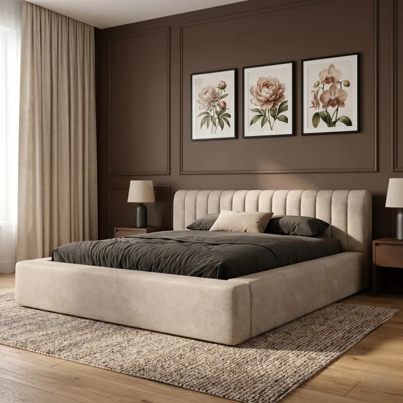 Na wizualizacji łóżko AMIRA zaprezentowano w tkaninie Macau Sand, w eleganckim beżowym odcieniu.