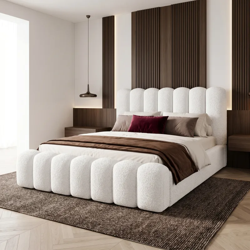Na zdjęciu łóżko zaprezentowane jest w tkaninie boucle Quelle 01, w klasycznym białym kolorze.