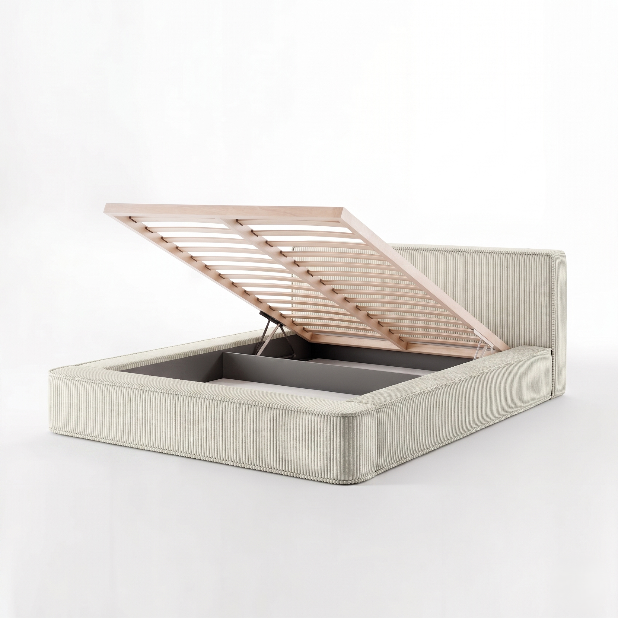 - stelaż do wyboru - drewniany (w cenie) - zapewnia stabilne podparcie materaca i odpowiednią cyrkulację powietrza, lub metalowy z podnośnikami gazowymi (za dopłatą) - ułatwia otwieranie pojemnika na pościel