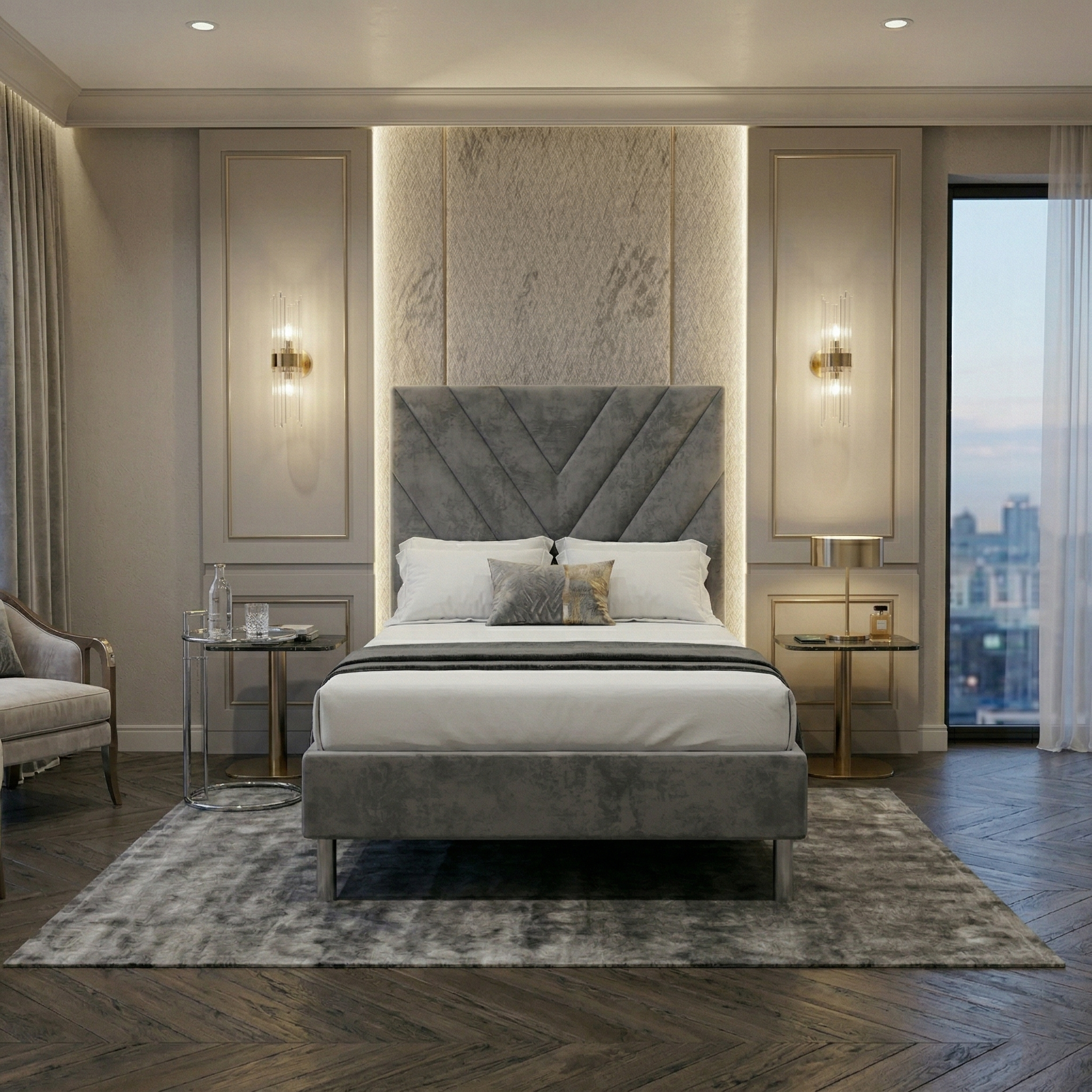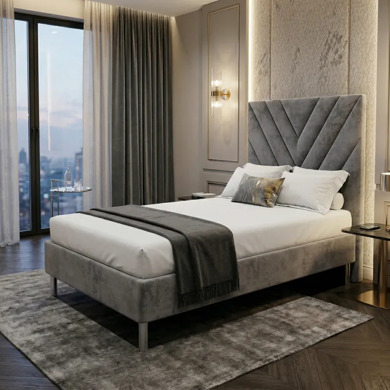 Łóżko tapicerowane hotelowe 90x200 AMBER szare welurowe "V"