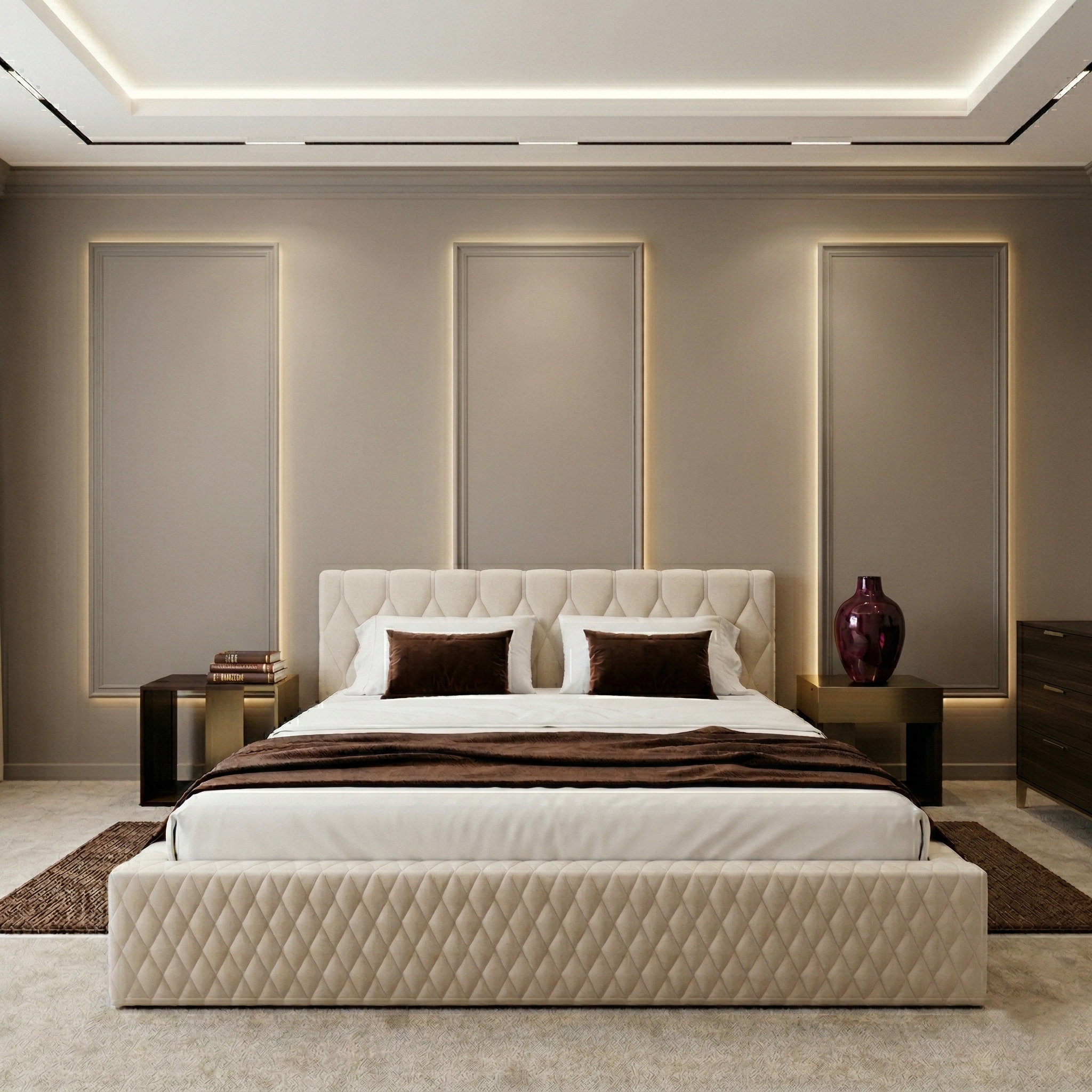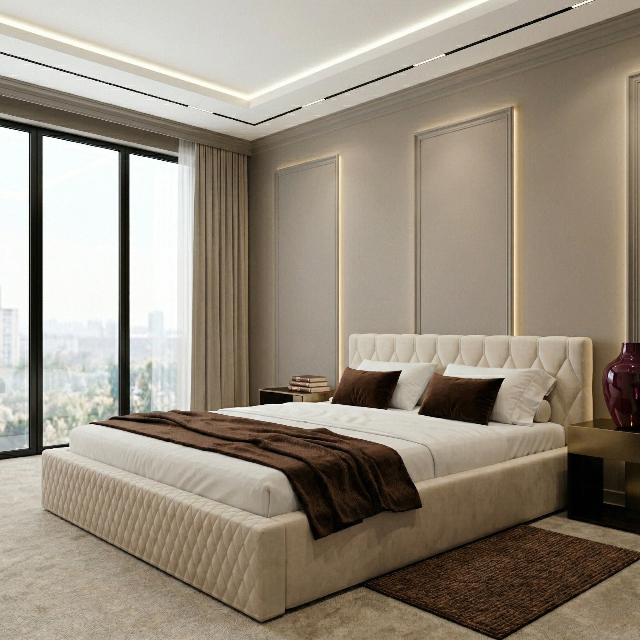 Na szczególną uwagę zasługuje fakt, że dekoracyjne pikowanie zostało zastosowane nie tylko na zagłówku, ale również na przednim panelu łóżka, co tworzy spójną i luksusową całość. Ten dopracowany detal podkreśla wysoką estetykę mebla i sprawia, że łóżko prezentuje się wyjątkowo elegancko z każdej strony.