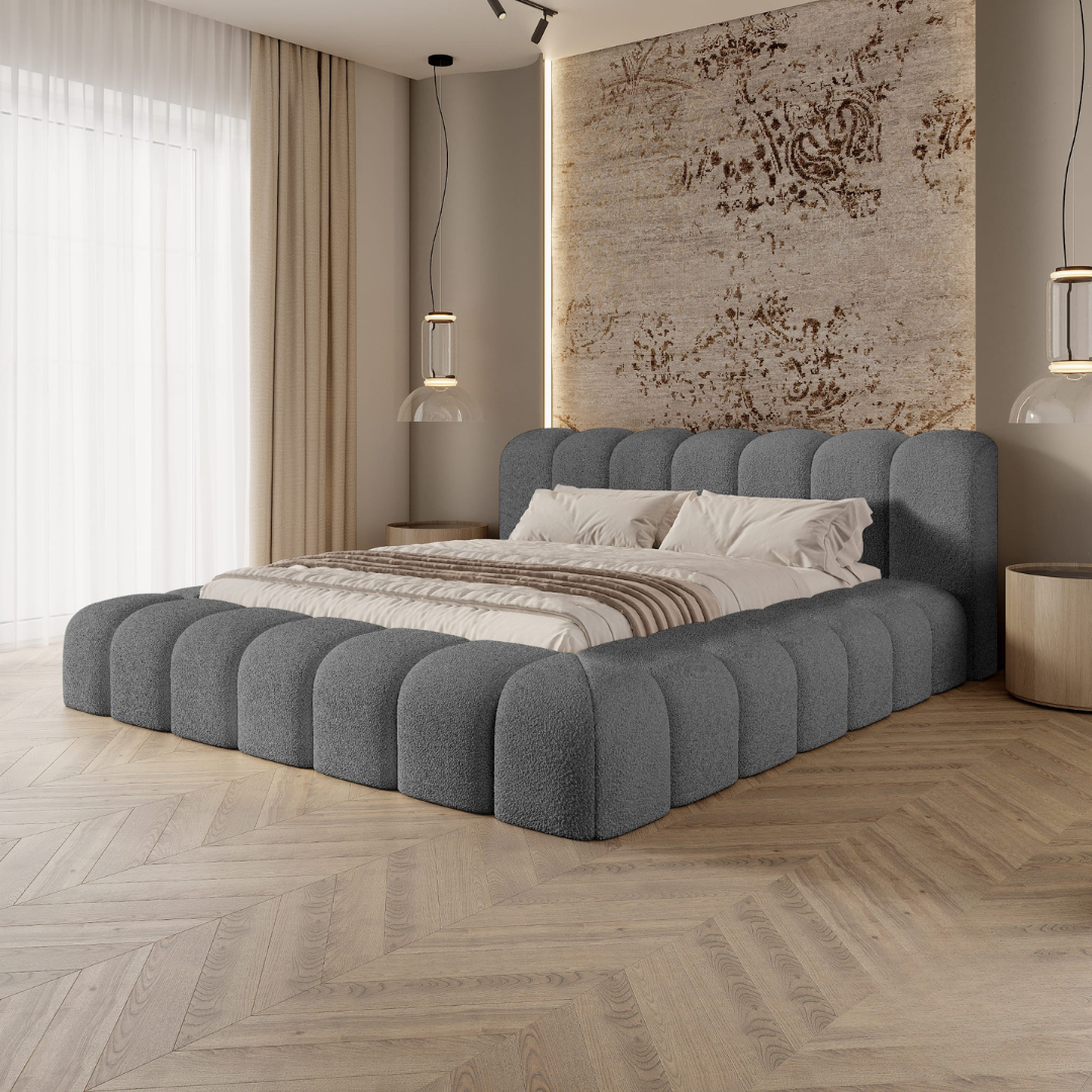 Łóżko tapicerowane szare AURORA 180x200 to propozycja dla osób, które traktują sypialnię jako świadomie zaprojektowaną przestrzeń estetyki i wyciszenia. Jego obła, modułowa bryła oraz charakterystyczny zagłówek w formie pionowych łuków tworzą harmonijną, rzeźbiarską kompozycję, która natychmiast przyciąga wzrok i nadaje wnętrzu wyjątkowy charakter.
