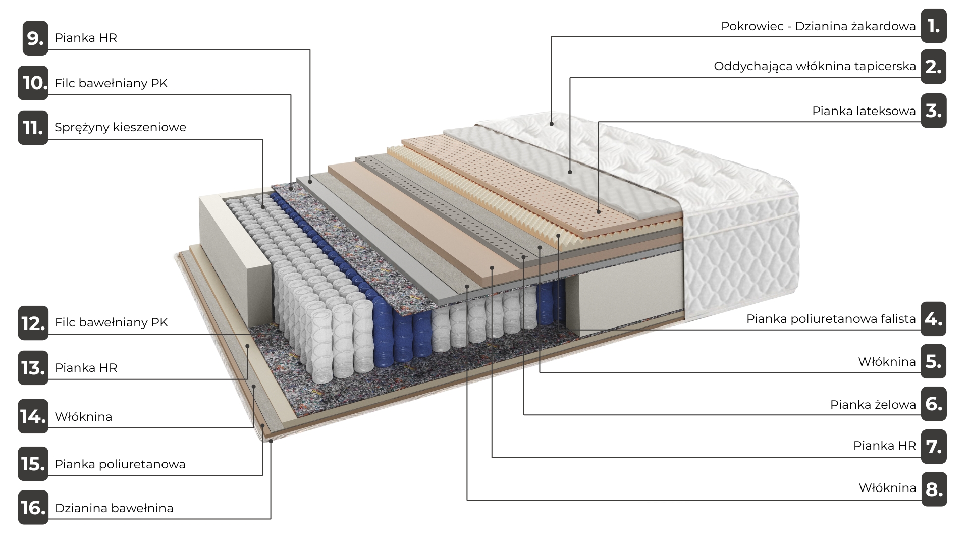 Świadomie zaprojektowana architektura 16 warstw Każda warstwa ma swoje zadanie. Każda wzmacnia poprzednią. Każda wspiera kolejną - tworząc spójną, przemyślaną konstrukcję materaca Premium, zaprojektowaną dla komfortu, stabilnego podparcia ciała i długowieczności użytkowania.