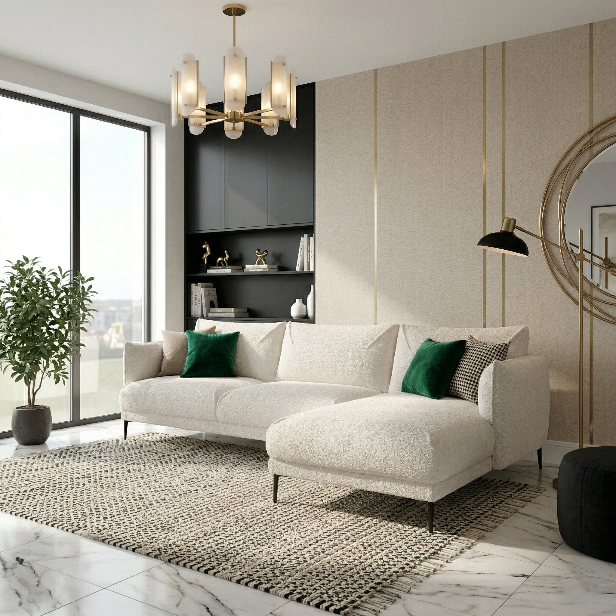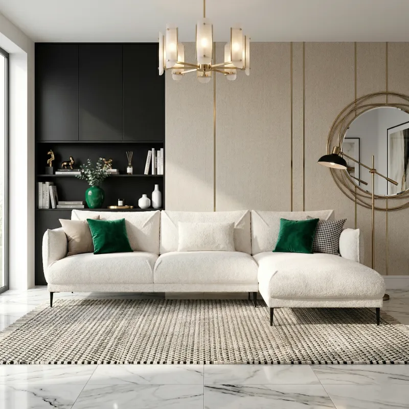 Zaprojektowany z myślą o nowoczesnych wnętrzach, narożnik FENIX to idealne połączenie funkcjonalności i minimalistycznej elegancji. Jego geometryczna forma i subtelne przeszycia podkreślają nowoczesny charakter, a tkanina boucle dodaje mu ponadczasowej klasy.