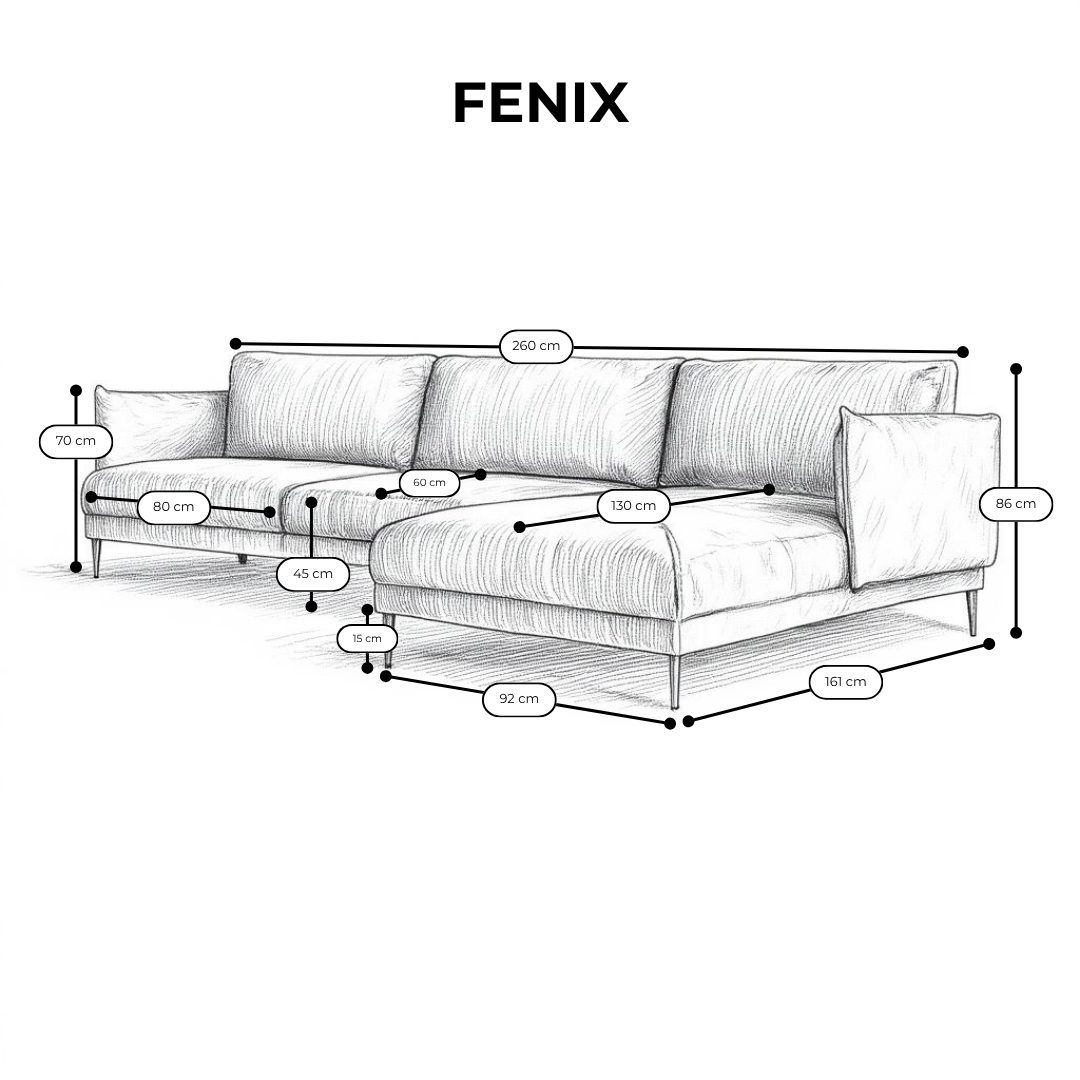 Dzięki kompaktowym wymiarom i przemyślanemu kształtowi litery „L” FENIX doskonale odnajdzie się zarówno w mniejszych mieszkaniach, jak i przestronnych salonach, stanowiąc stylowy punkt centralny każdego wnętrza.