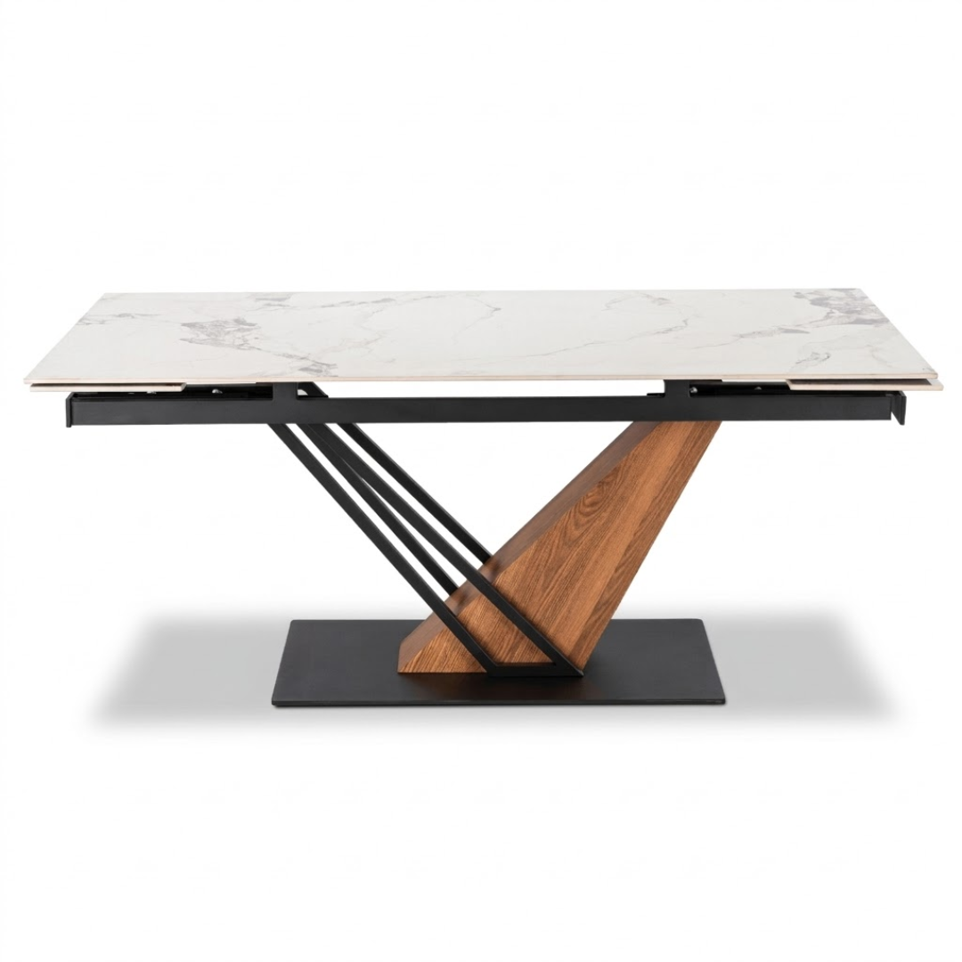 Nowoczesny stół rozkładany prostokątny MARBLIS 180-240 cm, ceramiczny blat biały/czarny marmur, nogi orzechowe, do jadalni