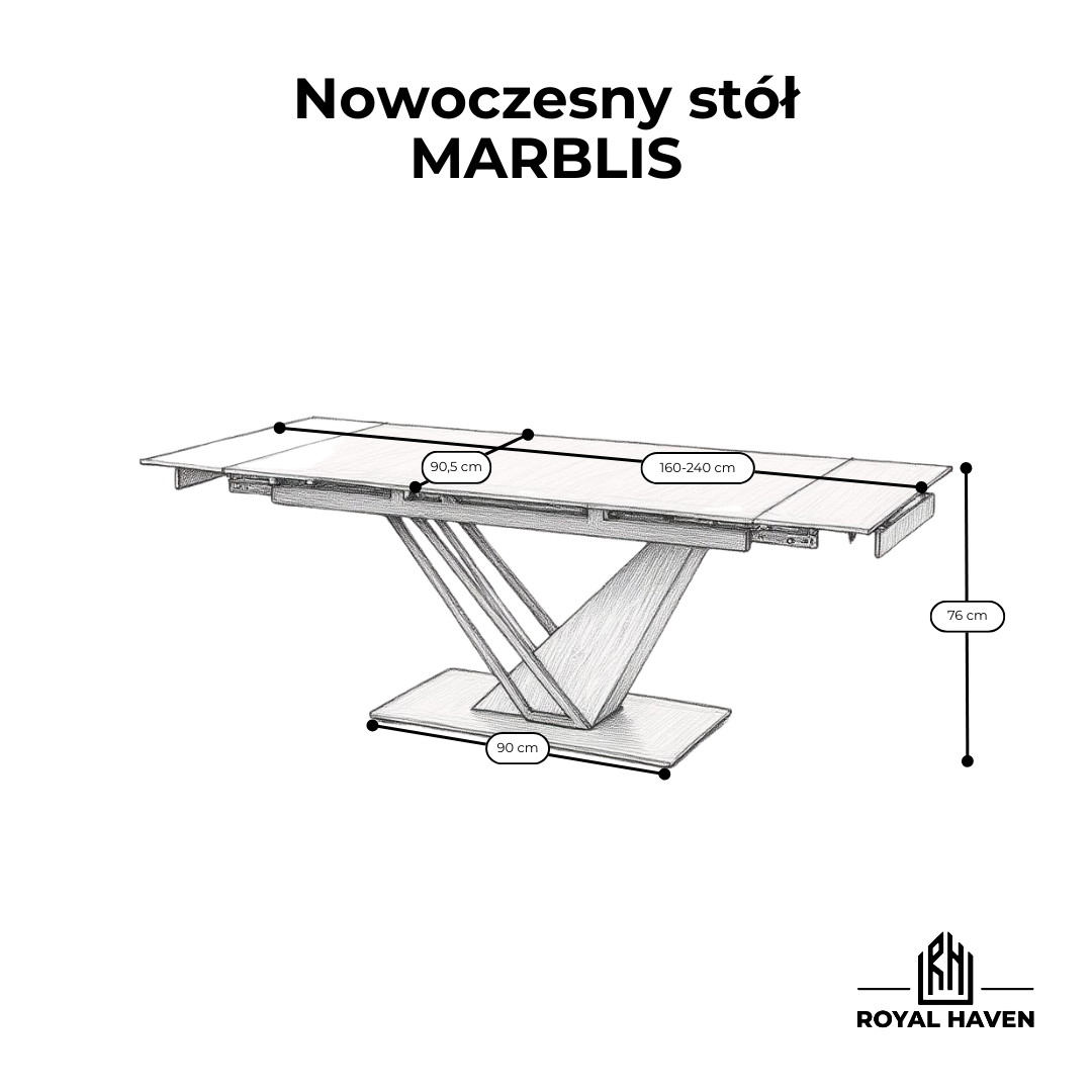 Dzięki zaawansowanemu mechanizmowi rozkładania, stół MARBLIS można szybko i płynnie powiększyć z 180 cm do 240 cm, bez dodatkowych wkładek. Rozsuwany blat sprawdza się idealnie podczas rodzinnych spotkań, przyjęć i uroczystych okazji, zapewniając wygodę wszystkim gościom.