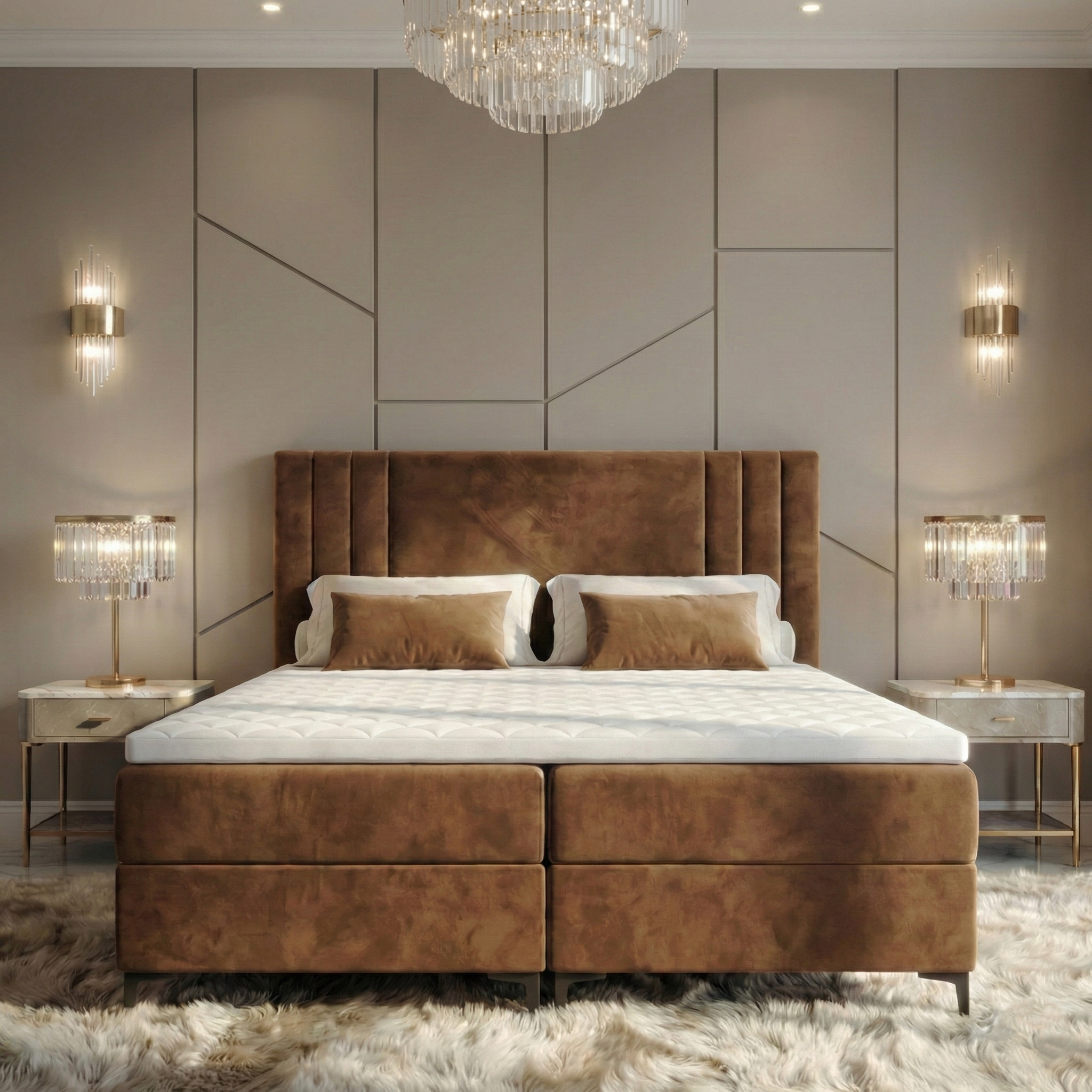Łóżko kontynentalne HILTON 160x200 brązowe to propozycja dla osób, które oczekują najwyższego standardu snu połączonego z elegancką, ponadczasową formą. Wysoka powierzchnia spania, dopracowane proporcje oraz luksusowe wykończenie sprawiają, że model ten staje się centralnym punktem sypialni i wprowadza atmosferę prywatnego apartamentu hotelowego.