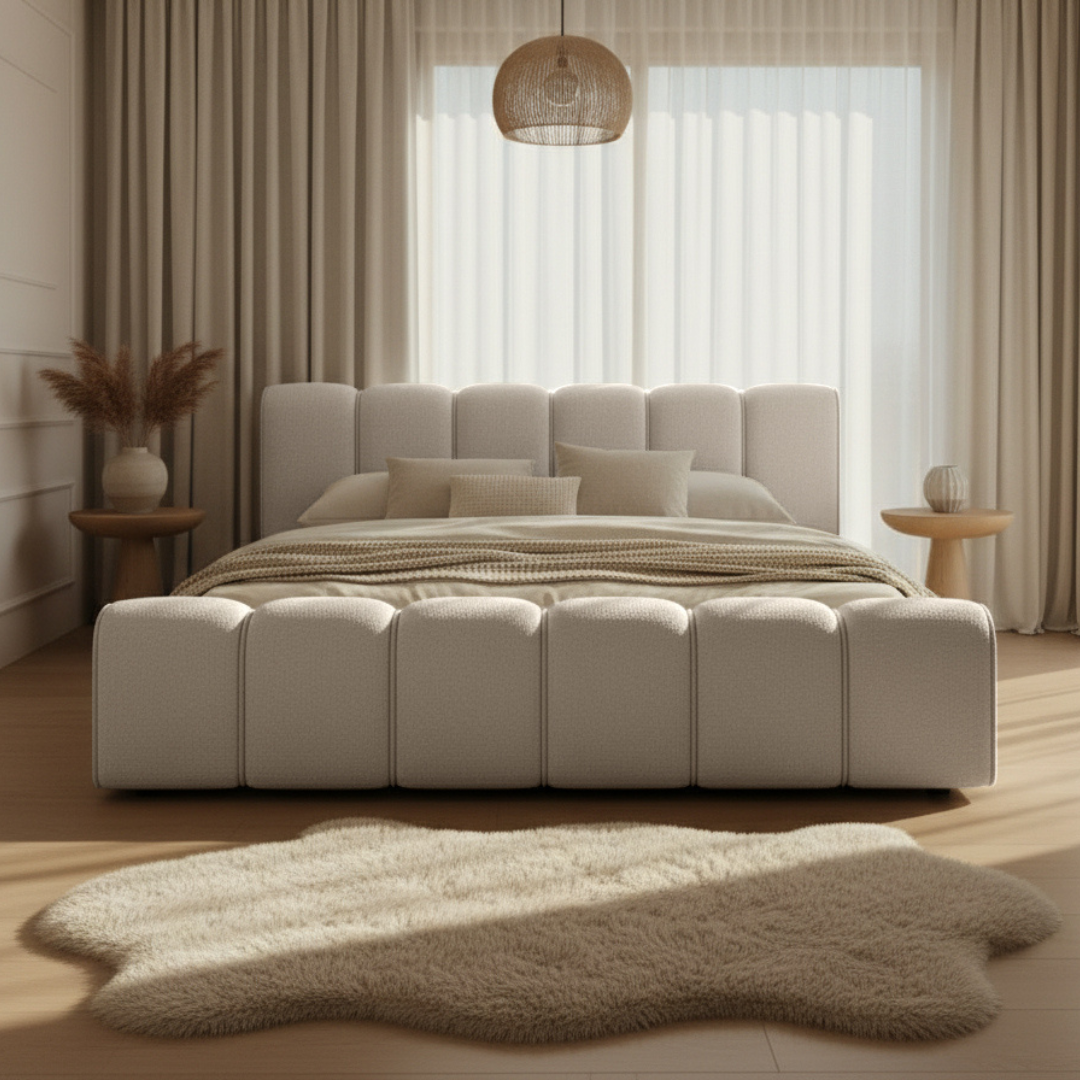 Łóżko tapicerowane beżowe 140x200 ADELL to idealne łóżko do sypialni, stworzone z myślą o osobach, które chcą, aby ich przestrzeń wypoczynku emanowała harmonią, światłem i subtelną elegancją. To nowoczesne łóżko z zagłówkiem, którego miękko zaokrąglona forma nadaje wnętrzu lekkości, a jednocześnie tworzy wyrazistą, designerską kompozycję.