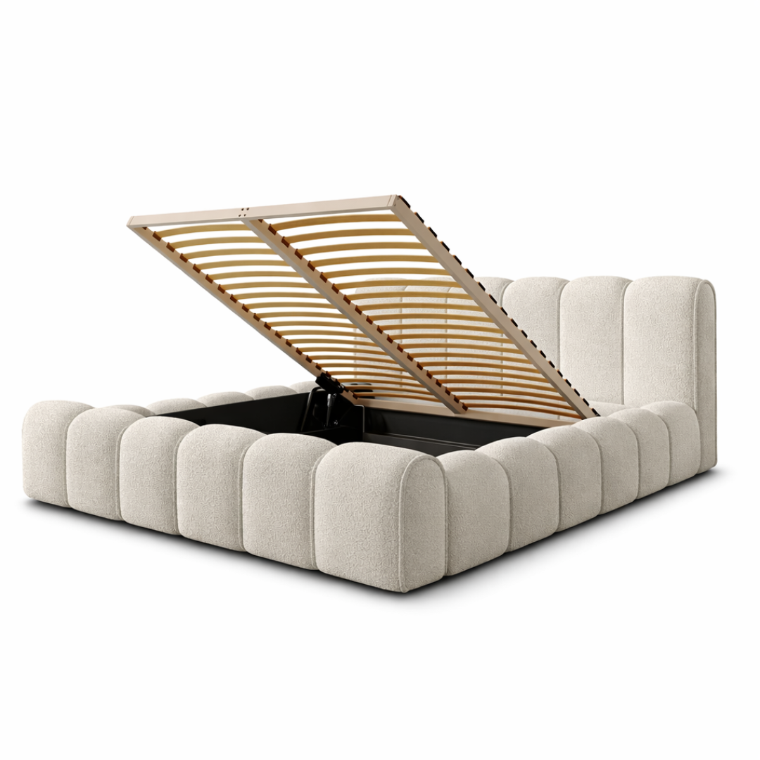 Łóżko tapicerowane ADELL 140x200 beżowe ze stelażem drewnianym i pojemnikiem na pościel