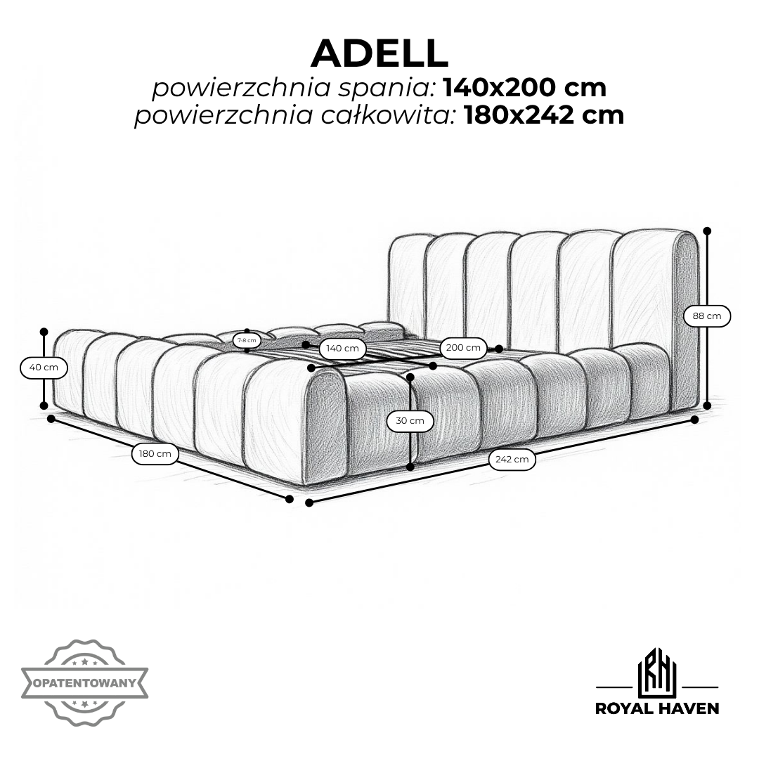 Łóżko ADELL wyróżnia się autorskim designem i dopracowanymi detalami. Projekt został objęty ochroną jako zastrzeżony wzór przemysłowy. Numer patentu: 015099472-0001