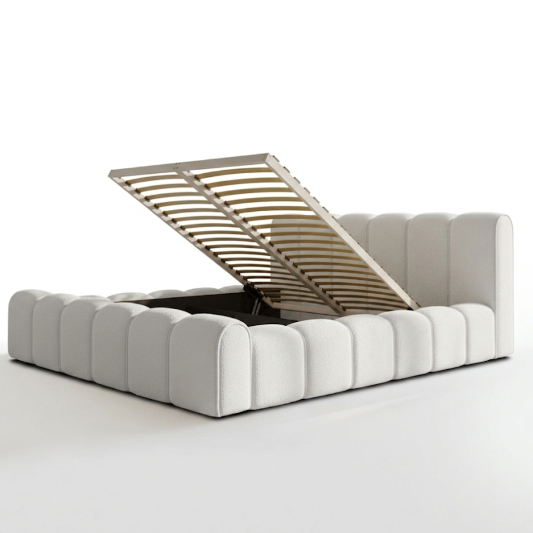 Łóżko tapicerowane ADELL 140x200 białe ze stelażem drewnianym i pojemnikiem na pościel