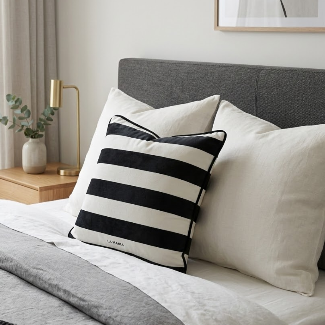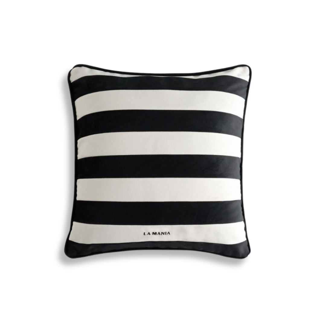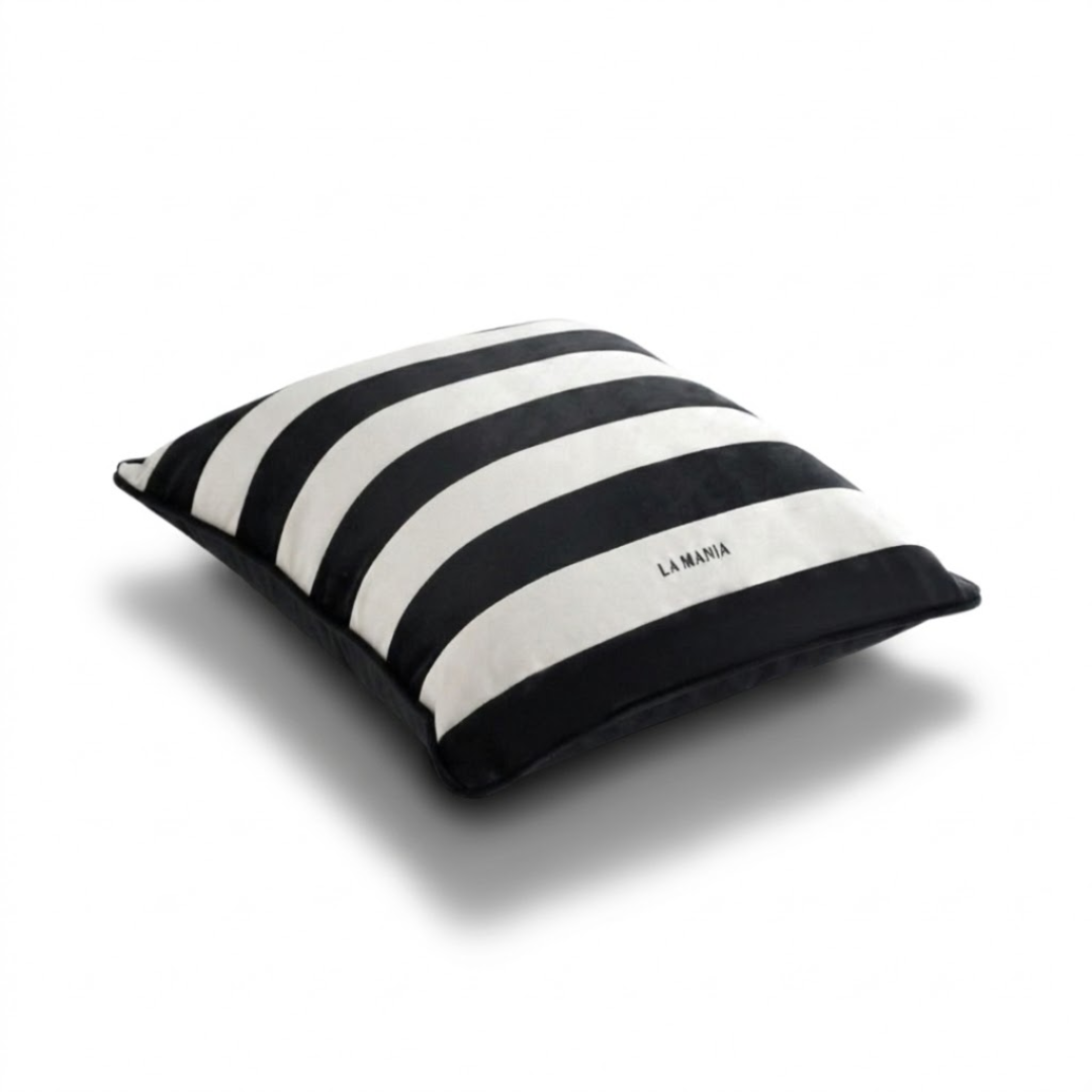 Charakterystyczne czarno-białe pasy nadają poduszce wyrazisty, nowoczesny styl inspirowany światem mody. Całość uzupełnia haftowane logo La Mania, które podkreśla ekskluzywny rodowód kolekcji i stanowi elegancki detal dekoracyjny. Starannie obszyte czarne ranty tworzą estetyczną ramę i nadają formie wyrazistości.