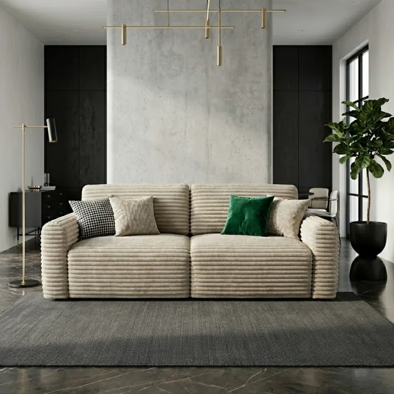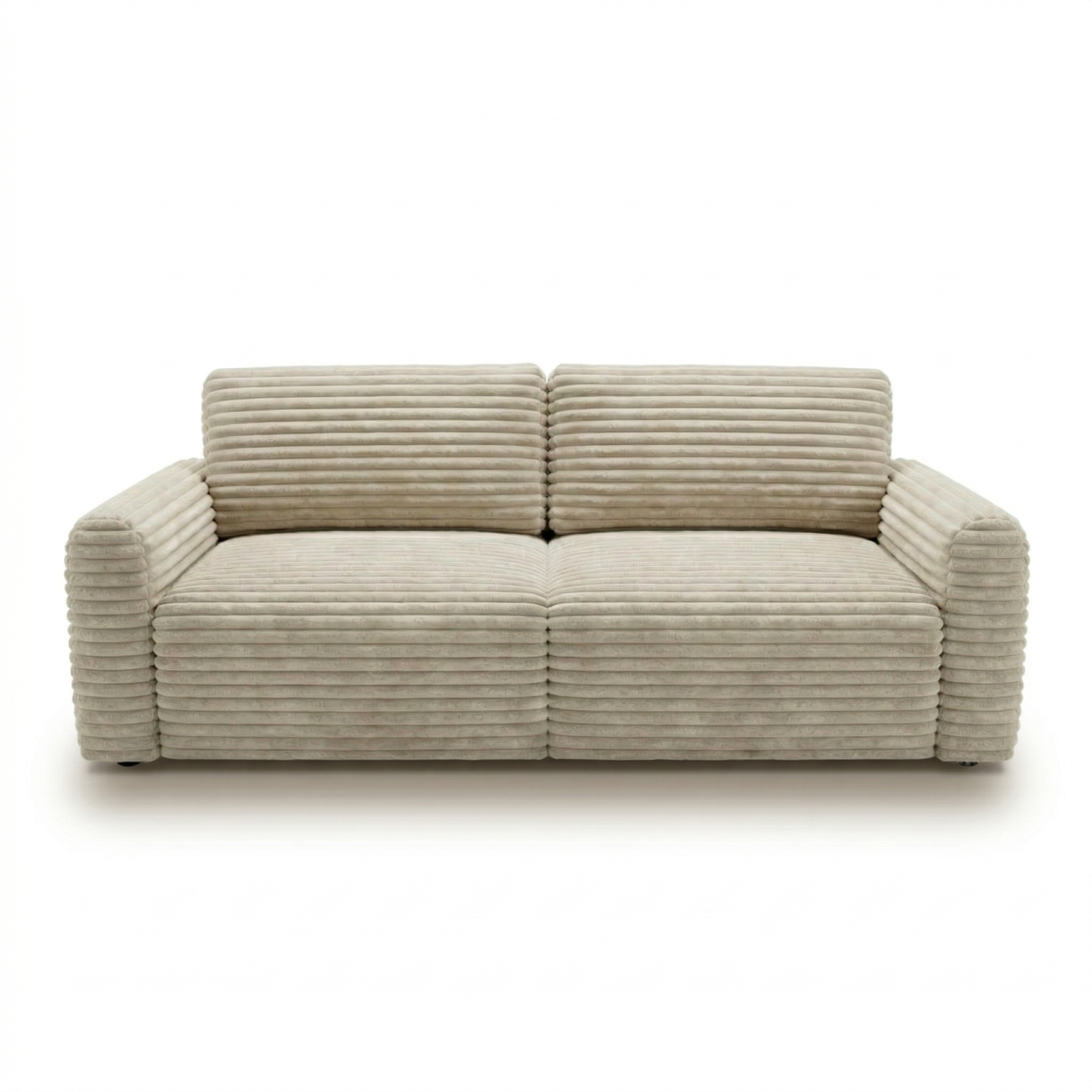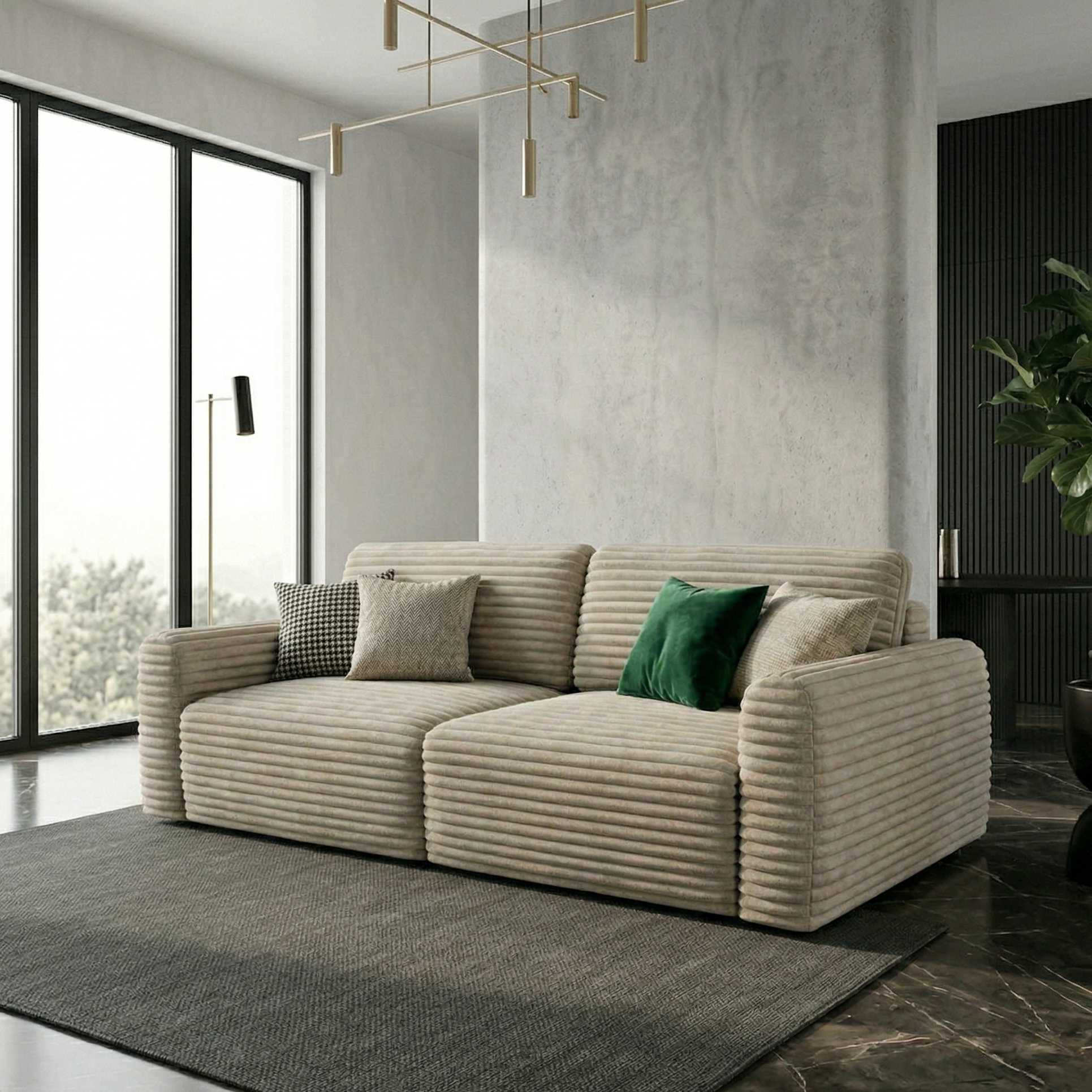 Na wizualizacji sofa Teddy zaprezentowana została w tkaninie sztruksowej Vito 23 - w biało-beżowym kolorze. Jest to materiał o charakterystycznej prążkowanej strukturze, miękki i przyjemny w dotyku, dzięki czemu doskonale podkreśla charakter mebla i wpisuje się w różne aranżacje wnętrz.