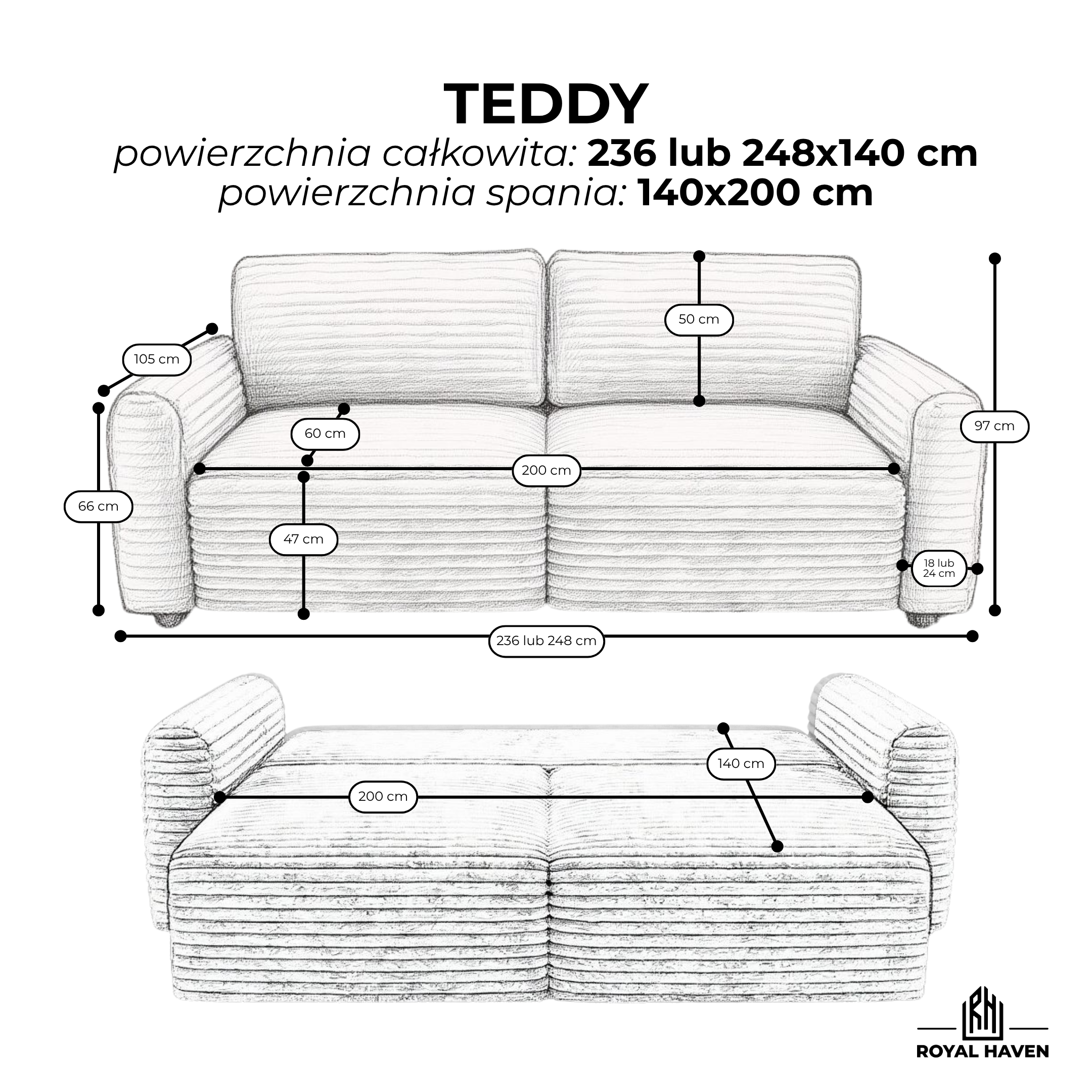 Sofa TEDDY dostępna jest w dwóch wariantach szerokości boczków - w wersji standardowej o szerokości 24 cm oraz w wersji węższej 18 cm. Pozwala to dopasować mebel do indywidualnych potrzeb oraz dostępnej przestrzeni w pomieszczeniu, co jest szczególnie istotne w przypadku mniejszych wnętrz.