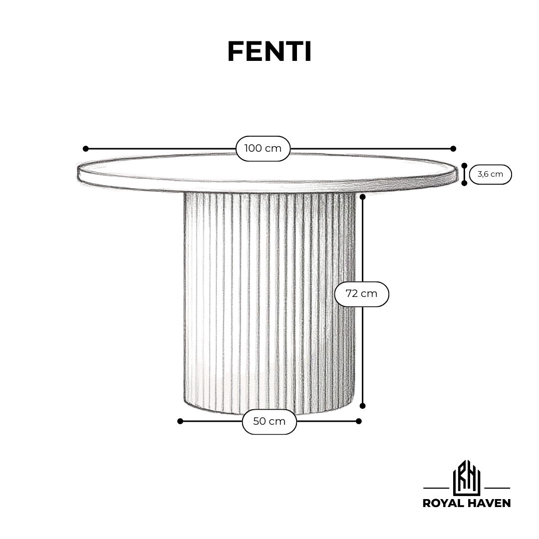 Charakterystyczna, ryflowana podstawa nadaje bryle wyjątkowej lekkości i dekoracyjnego charakteru. Pionowe frezowania pięknie odbijają światło, tworząc efekt głębi i podkreślając ekskluzywny styl stołu. To detal, który sprawia, że FENTI staje się centralnym punktem aranżacji.