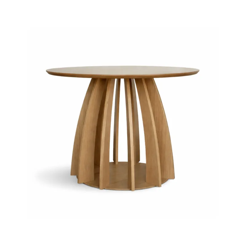 Najbardziej charakterystycznym elementem stołu jest ryflowana podstawa, starannie wykonana z dębu, która nadaje meblowi lekkości wizualnej, a jednocześnie zapewnia wyjątkową stabilność i trwałość konstrukcji. Nietuzinkowy kształt podstawy sprawia, że stół przyciąga wzrok i staje się centralnym punktem każdej jadalni, salonu czy przestronnej kuchni.