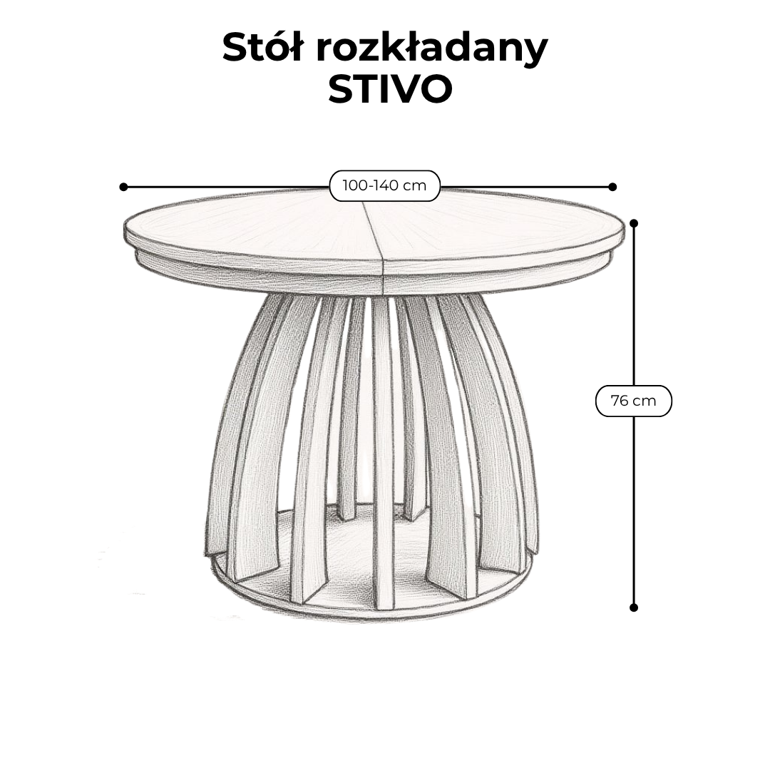 Szukasz stołu, który połączy nowoczesny design, praktyczną funkcję rozkładania i solidne wykonanie? Stół okrągły rozkładany STIVO to idealny wybór do jadalni, salonu lub nowoczesnej kuchni. Dzięki kompaktowej średnicy 100 cm stół doskonale sprawdzi się w codziennym użytkowaniu, a możliwość rozłożenia sprawia, że bez problemu pomieści więcej osób podczas rodzinnych spotkań czy przyjęć.