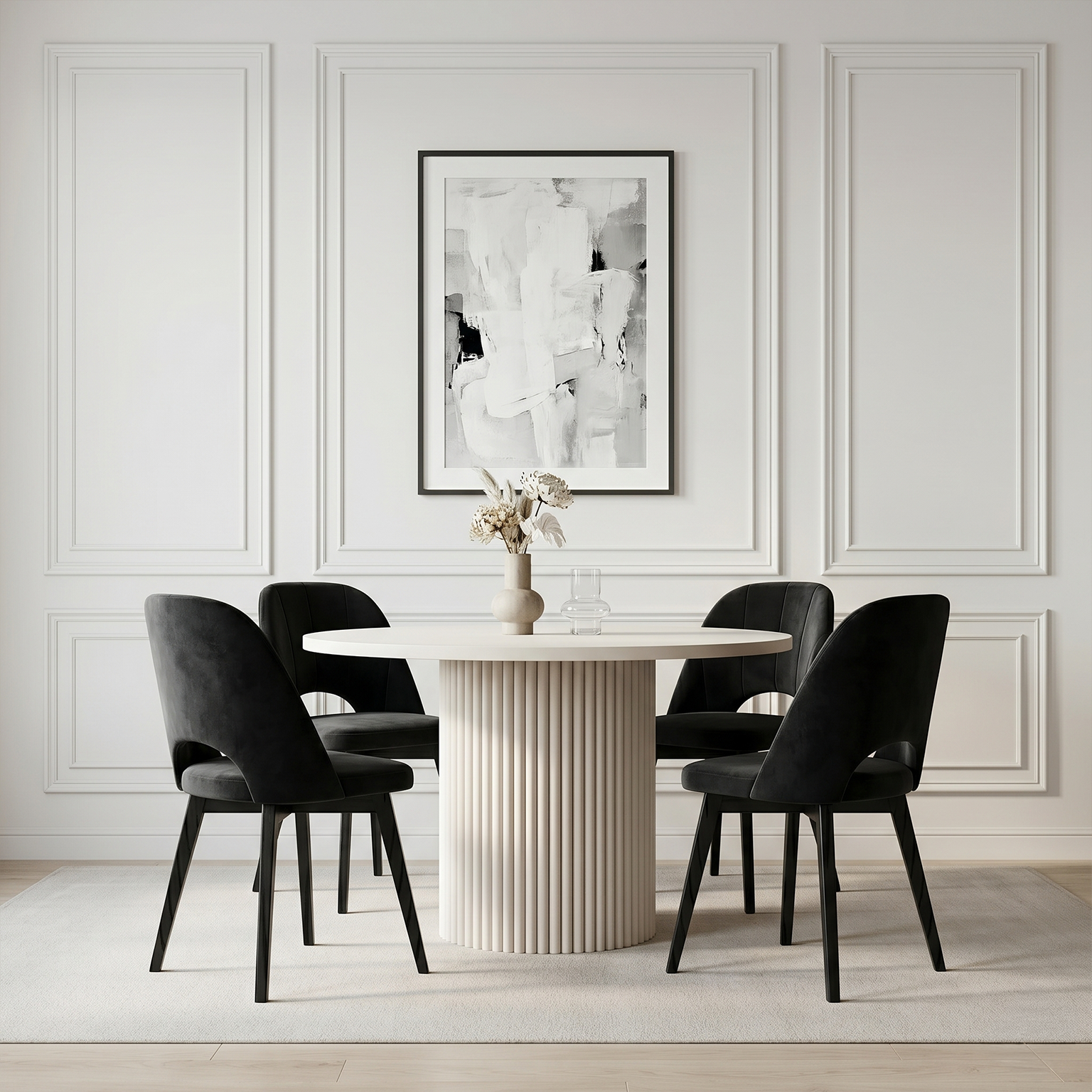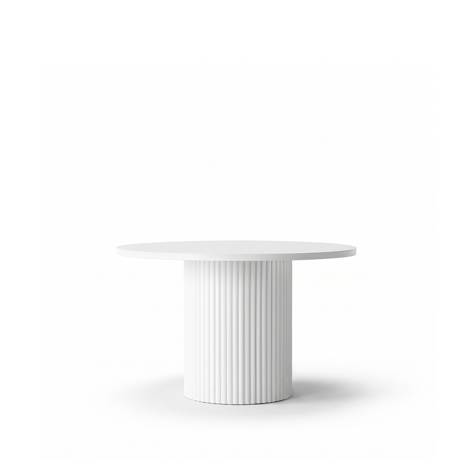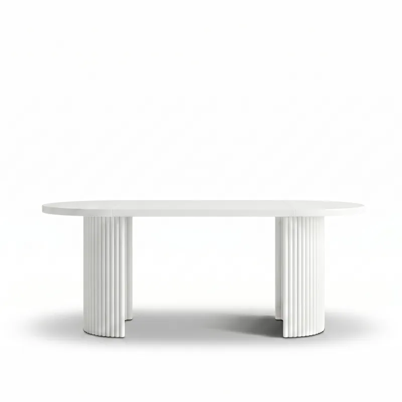 Charakterystyczna, ryflowana podstawa nadaje bryle lekkości i dekoracyjnego charakteru. Pionowe frezowania efektownie odbijają światło, tworząc wrażenie głębi i podkreślając nowoczesny styl stołu. To właśnie ten detal sprawia, że model FENTI staje się wyrazistym elementem aranżacji.