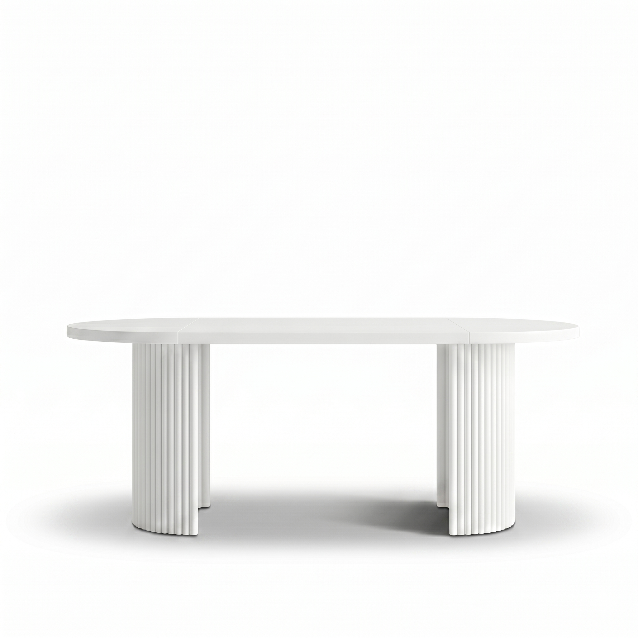 Na pierwszej wizualizacji stół FENTI przedstawiono w wersji rozłożonej, w ponadczasowym białym wybarwieniu. Na drugiej zaprezentowano model w wersji złożonej, w modnym i eleganckim kolorze kaszmir.