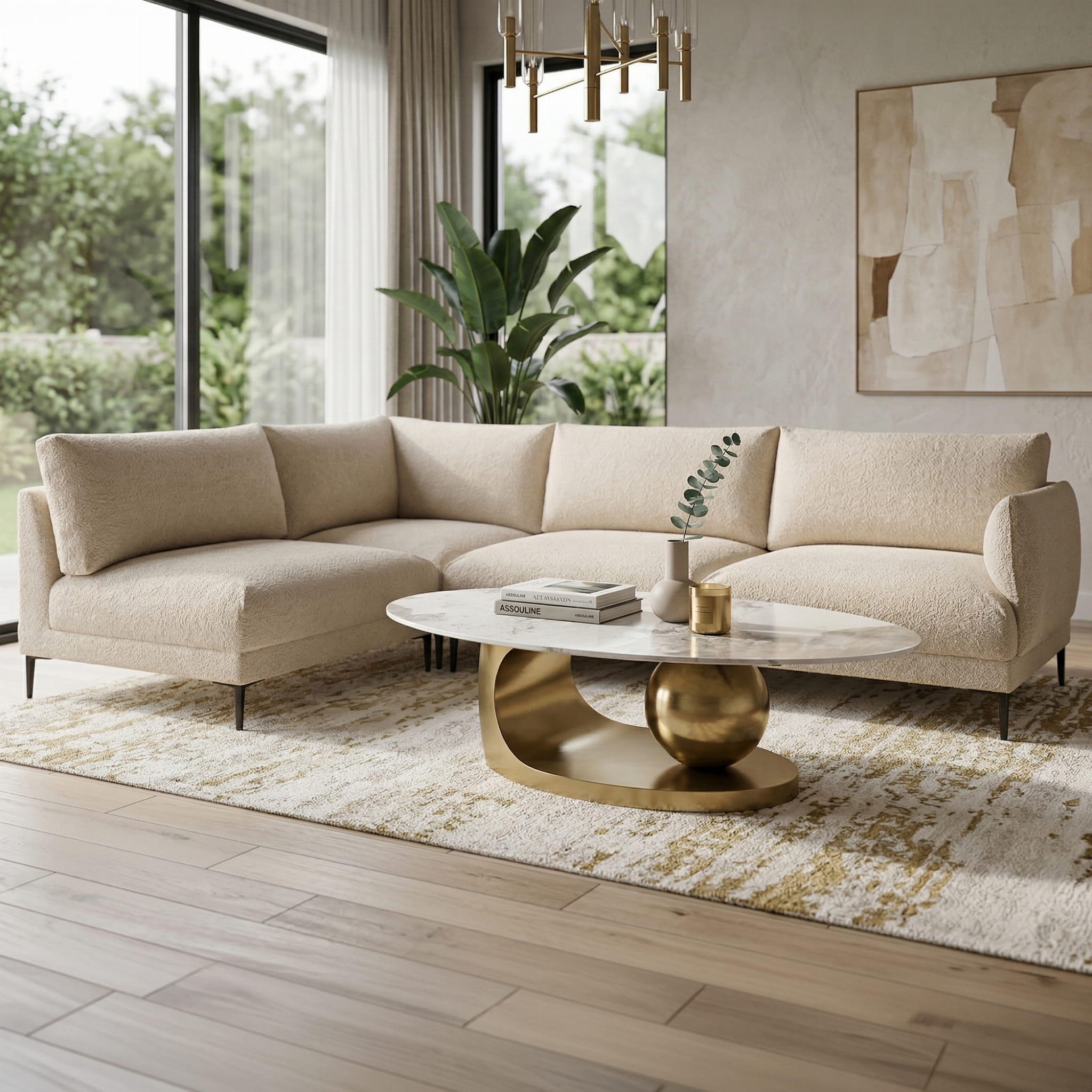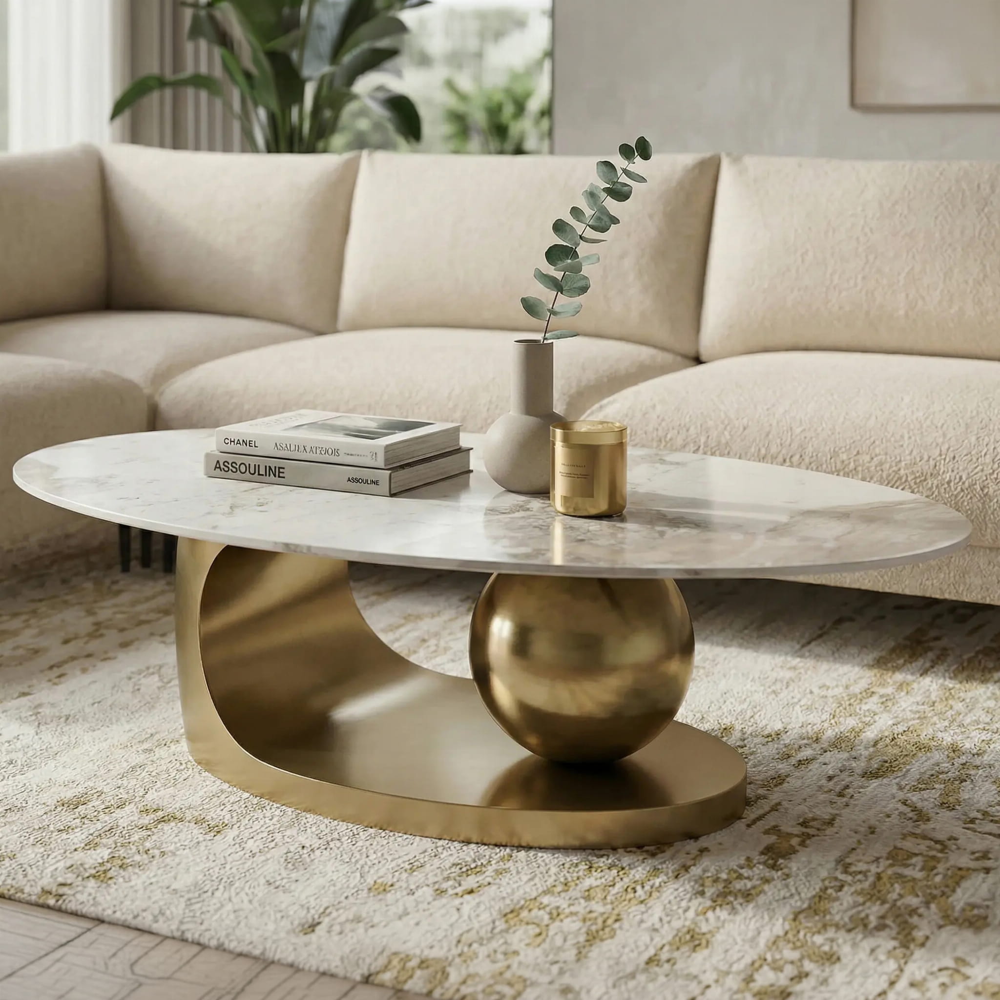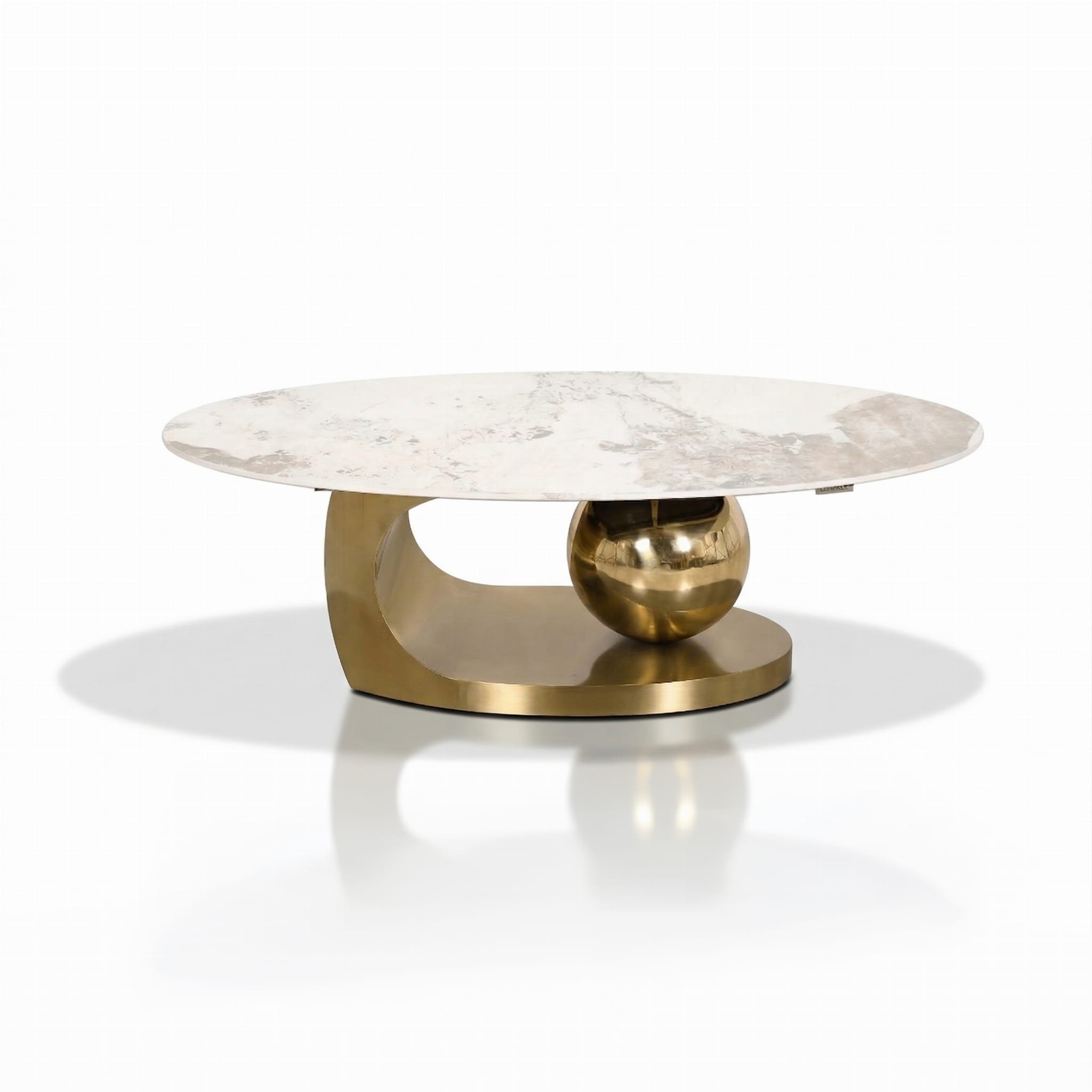 Podstawa wykonana ze stali nierdzewnej w złotym odcieniu, ozdobiona dekoracyjnym, kulistym motywem, dodaje stolikowi artystycznego charakteru i stabilności. Proste, dopracowane linie łączą się z minimalistycznym designem, tworząc mebel, który jest zarówno funkcjonalny, jak i wizualnie zachwycający.