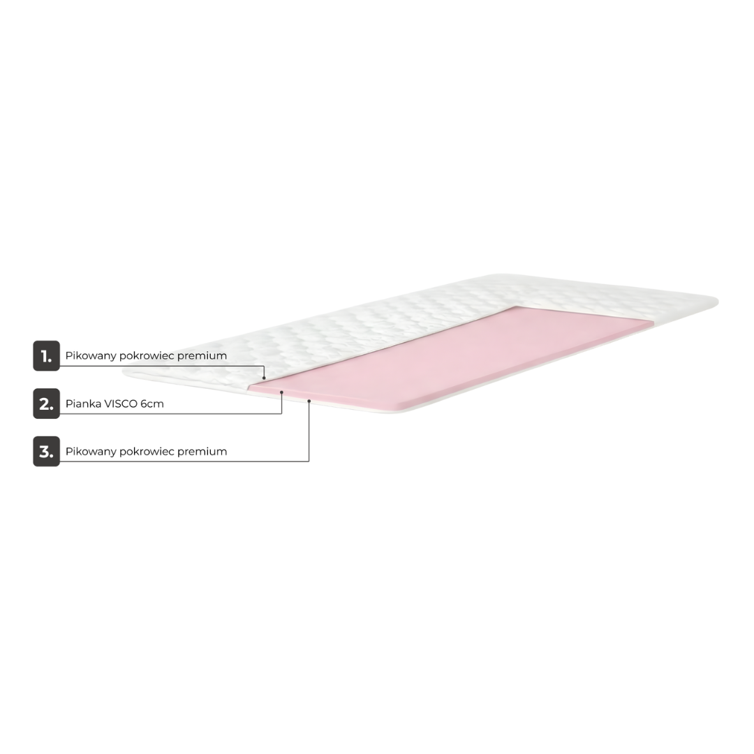 Topper na materac VISCO o wysokości 6 cm to prosty i skuteczny sposób na poprawę jakości snu bez konieczności wymiany materaca. Zastosowana termoelastyczna pianka VISCO w kolorze różowym reaguje na temperaturę ciała i nacisk, dzięki czemu precyzyjnie dopasowuje się do sylwetki, redukując punkty ucisku i napięcie mięśniowe.