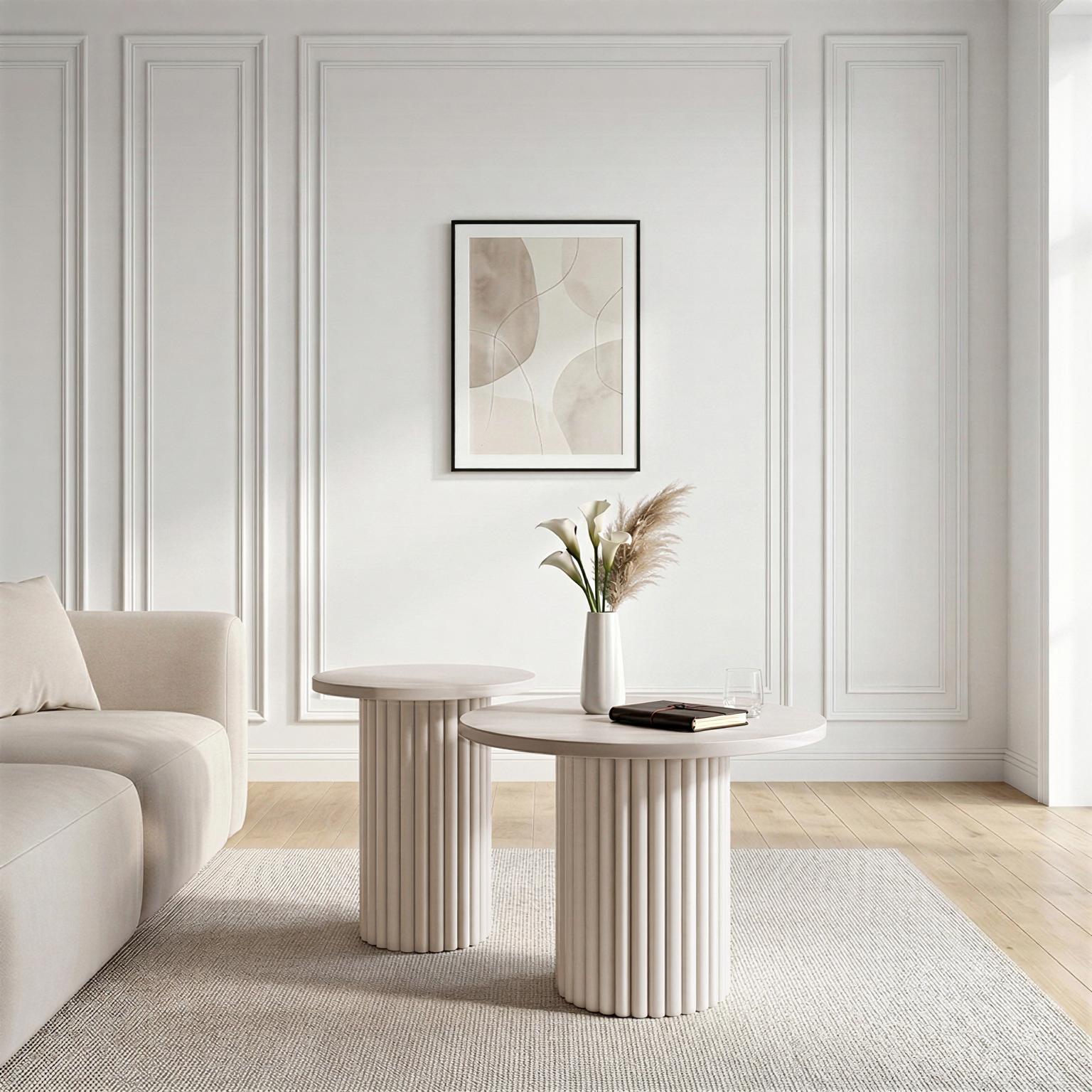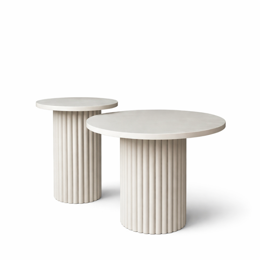 Zestaw stolików kawowych NOVA to nowoczesna forma, elegancja i funkcjonalność w jednym. Okrągłe blaty zestawione z dekoracyjnymi, ryflowanymi podstawami tworzą spójną kompozycję, która przyciąga uwagę i podkreśla charakter wnętrza.